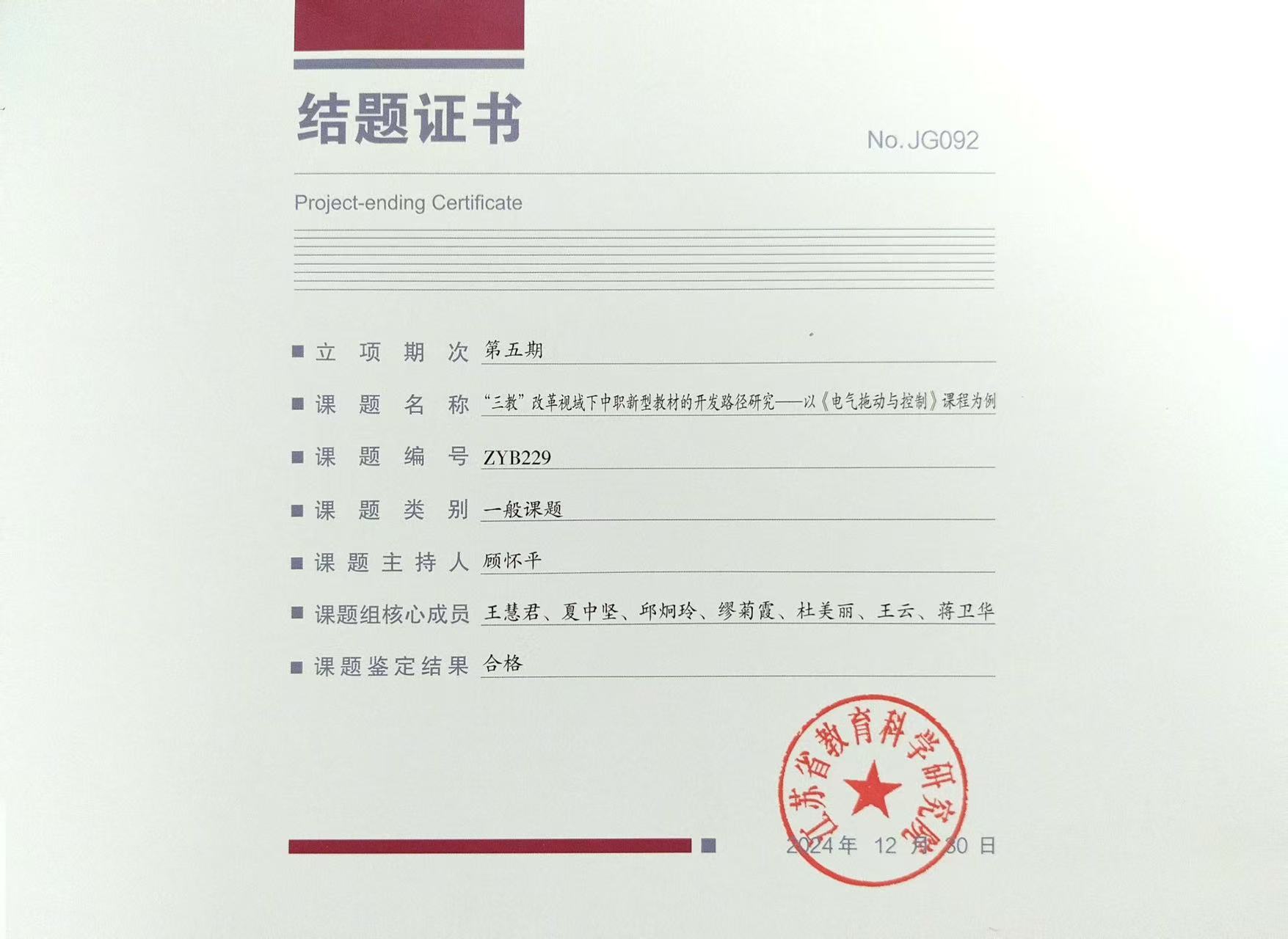 杜美丽老师参与的江苏省教科院课题《三教”改革视城下中职新型教材的开发路径研究———以《电气拖动与控制》课程为例》结题