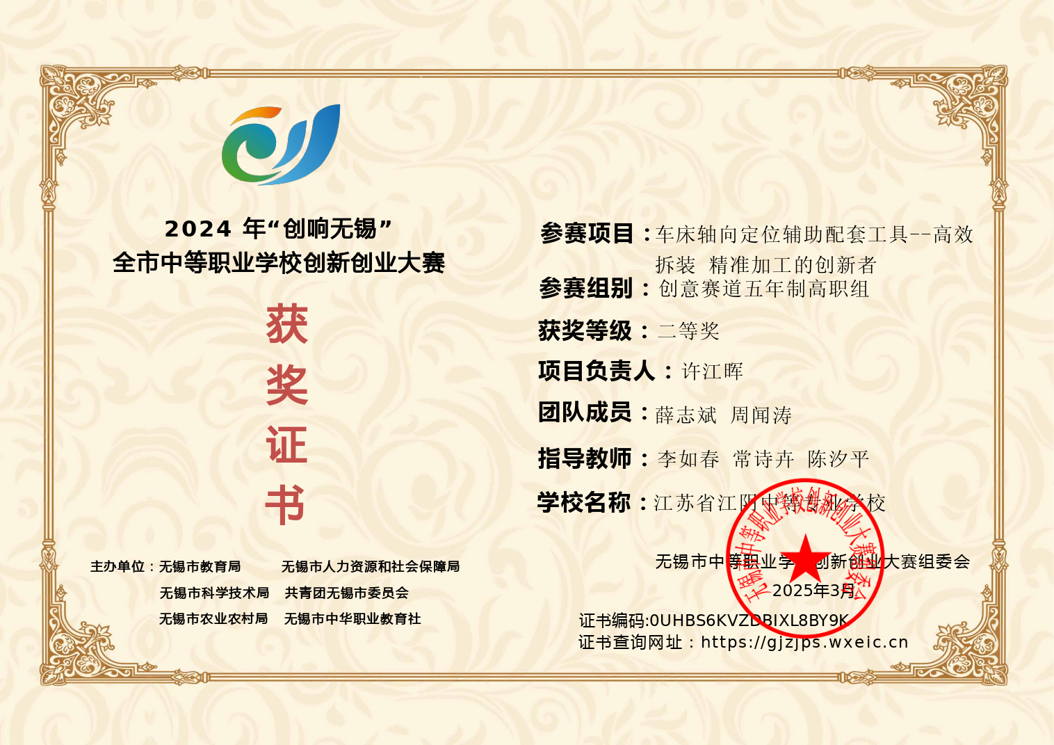 常诗卉老师在2024年“创响无锡”全市中等职业学校创新创业大赛中指导学生获得二等奖并被评为优秀指导教师