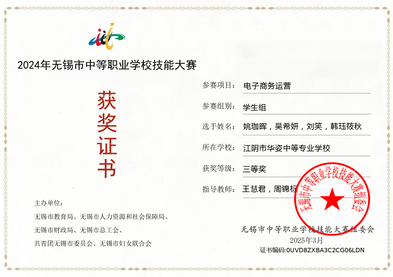 周锦标老师在2024年无锡市中等职业学校技能大赛中指导学生获得三等奖 2025-09-24