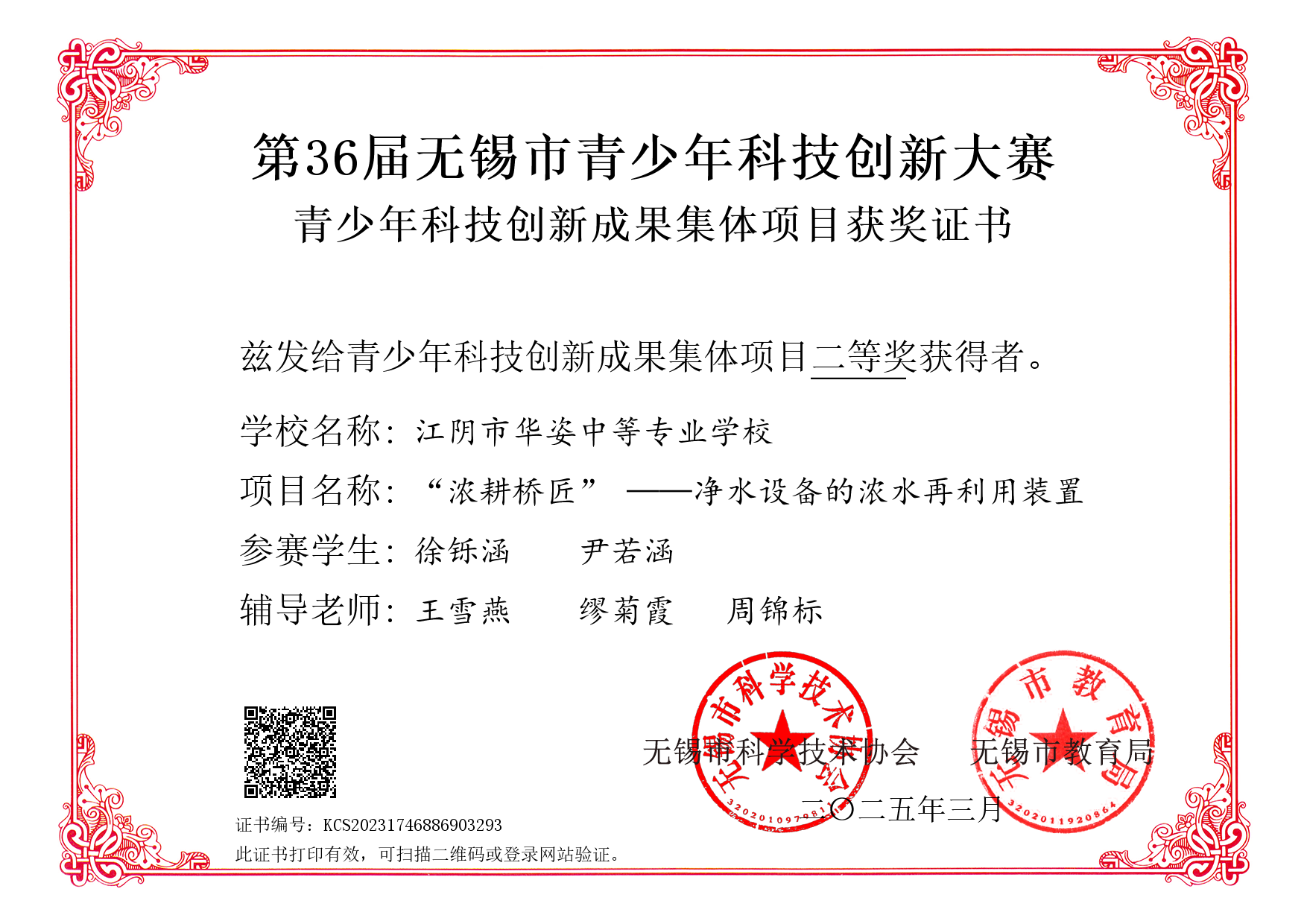 周锦标老师在第36届无锡市青少年科技创新大赛中指导学生获得二等奖