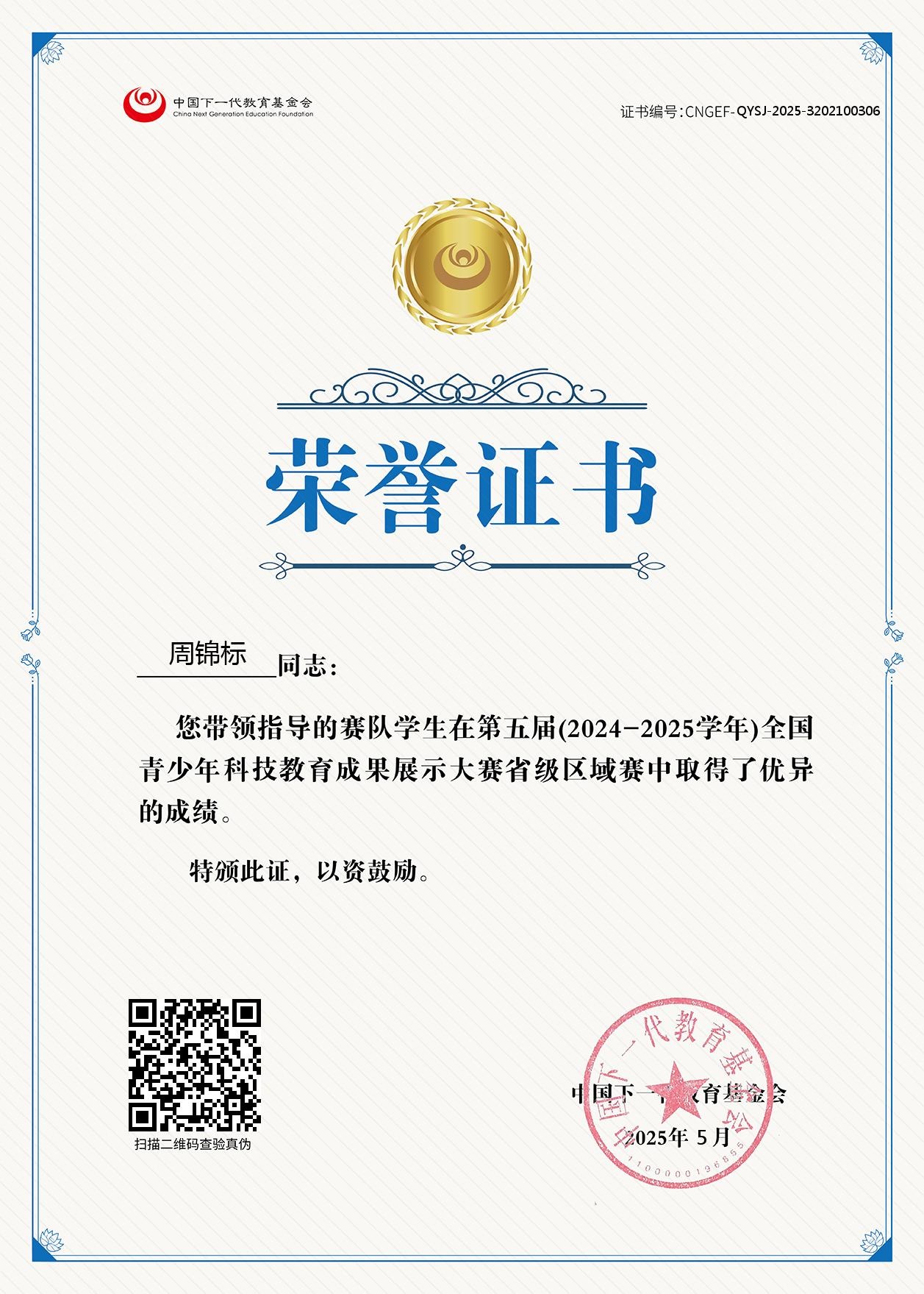 周锦标老师在第五届全国青少年科技教育成果展示大赛中指导学生获得一、二、三等奖和参与奖