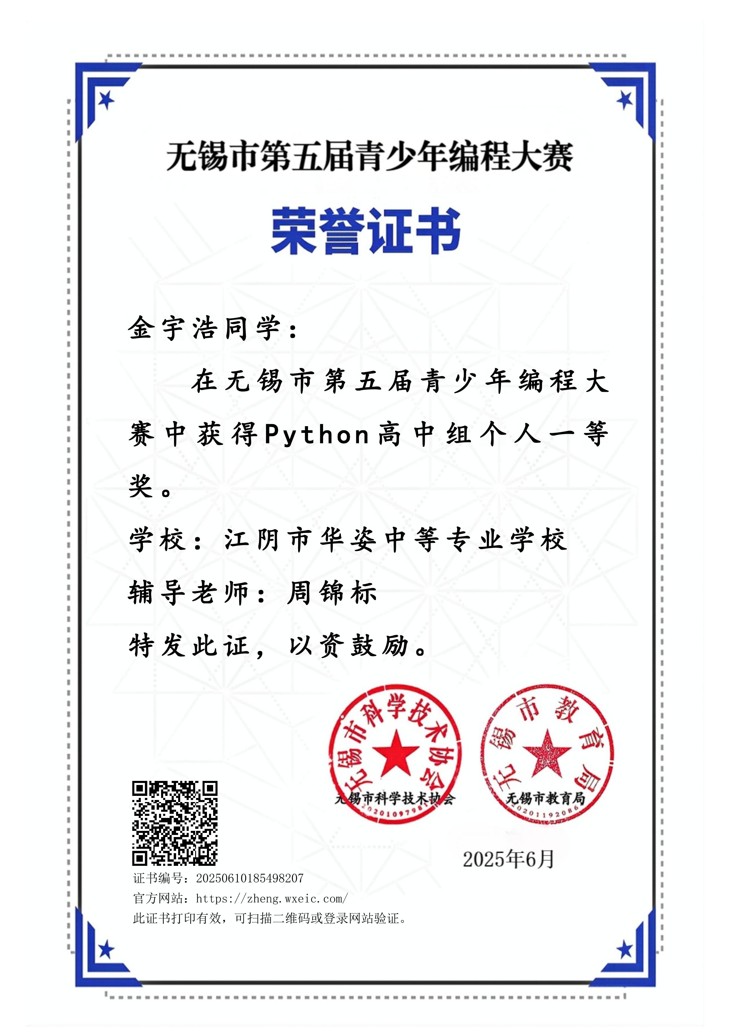 周锦标老师在锡市第五届青少年编程大赛中指导学生获得一等奖、二等奖并获得优秀辅导奖