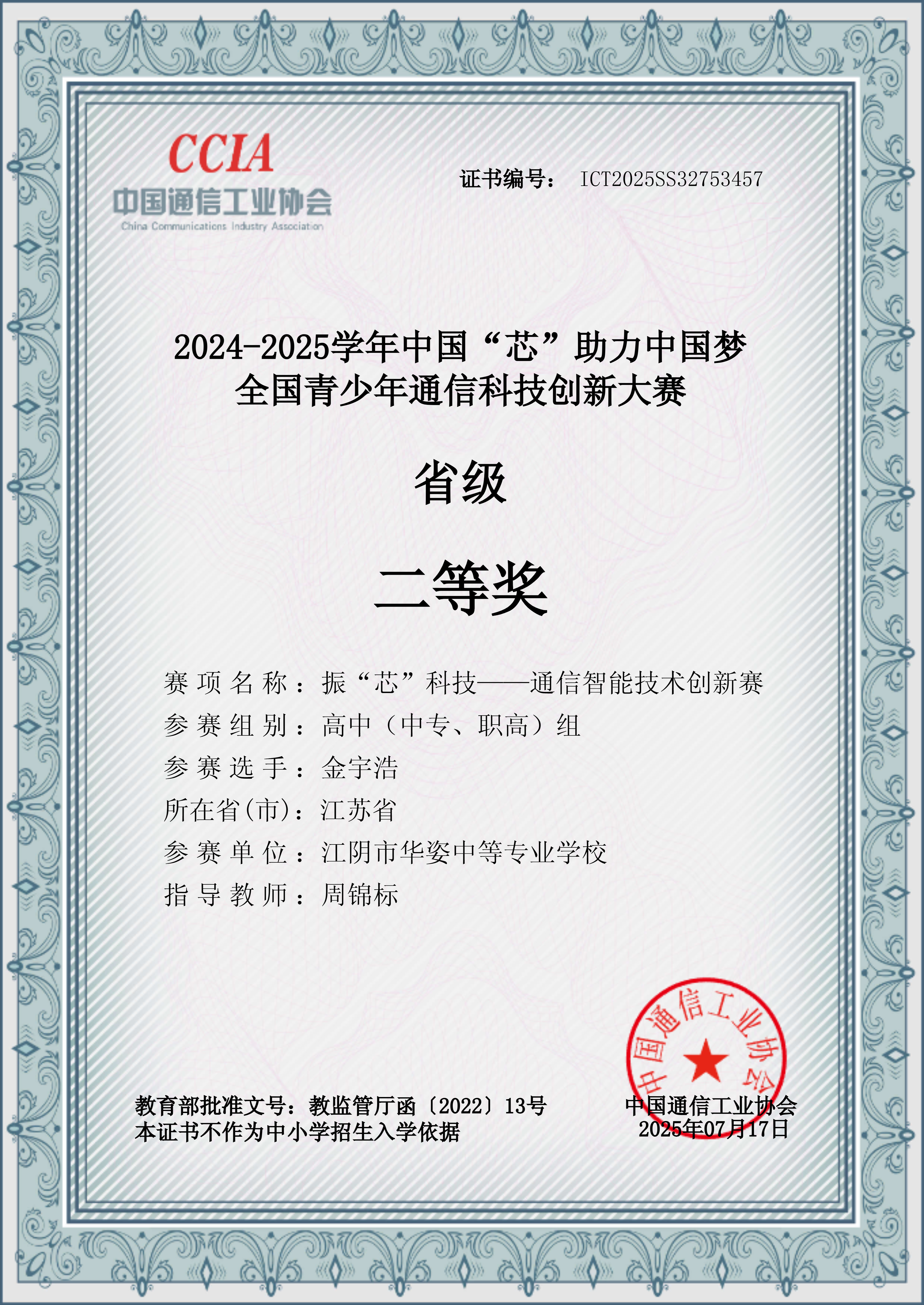 周锦标老师在2024-2025学年中国“芯"助力中国梦全国青少年通信科技创新大赛中指导学生获得二等奖 2025-09-25