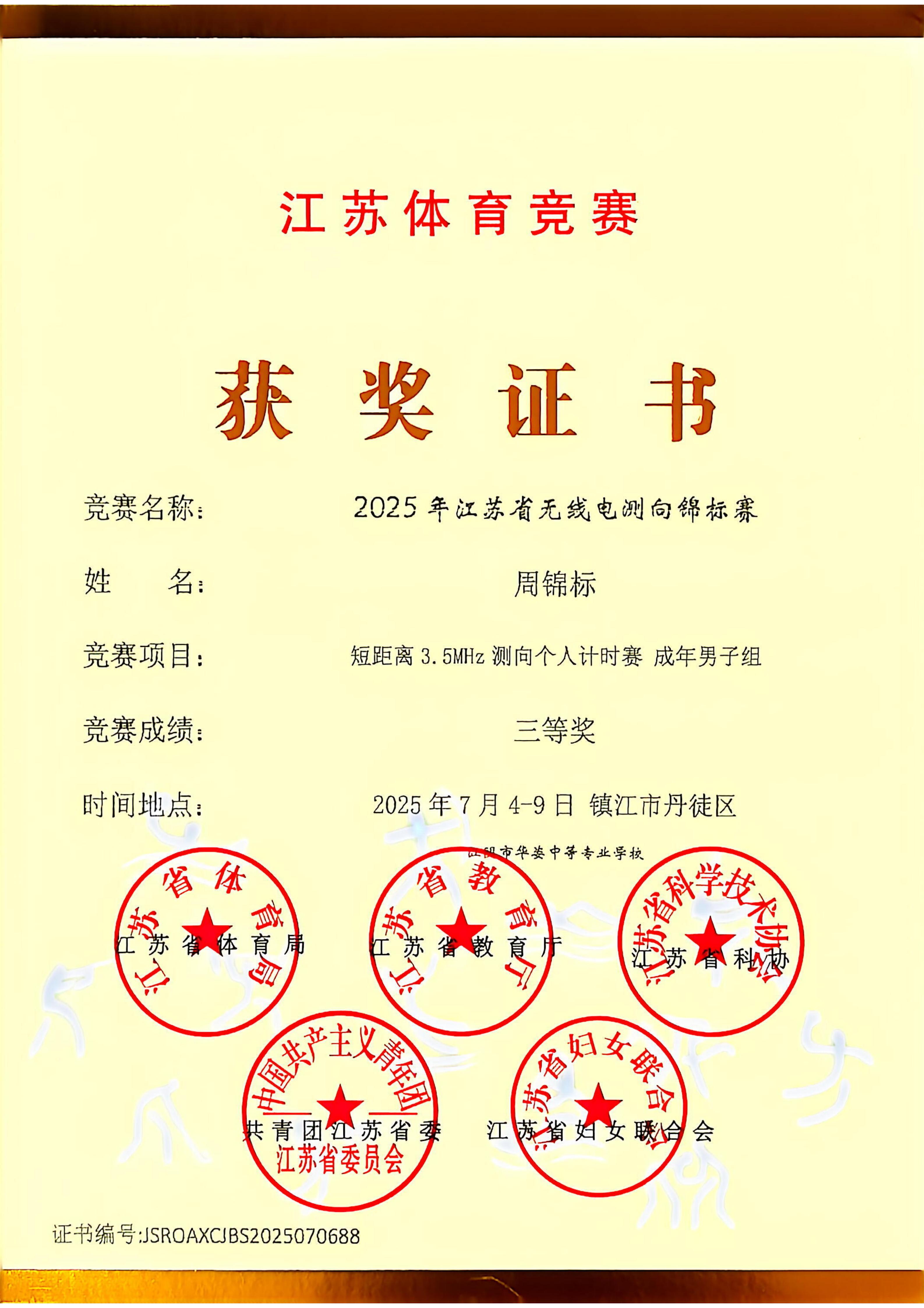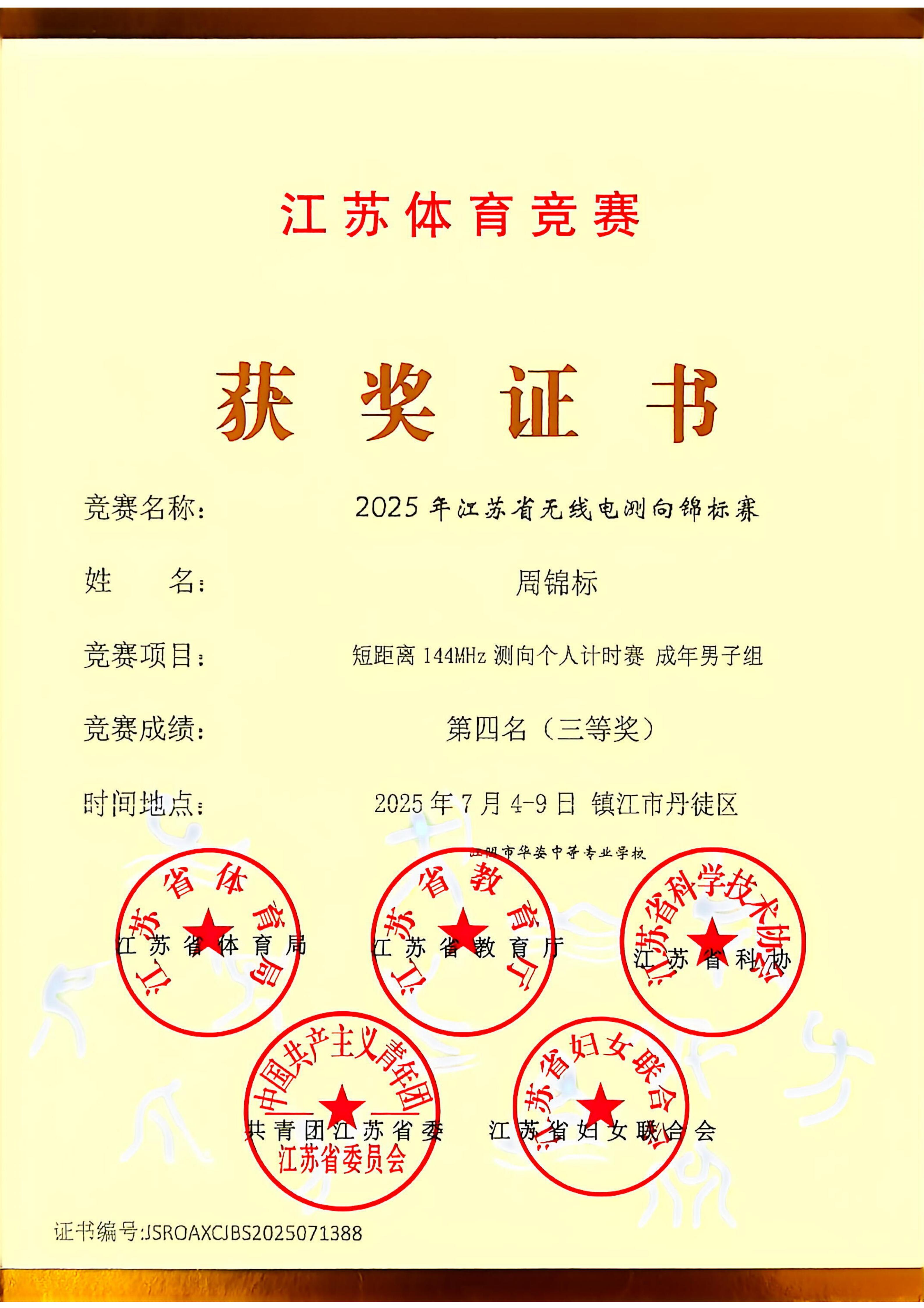 周锦标老师在2025年江苏省无线电测向锦标赛中获得三等奖并被评为优秀指导教练