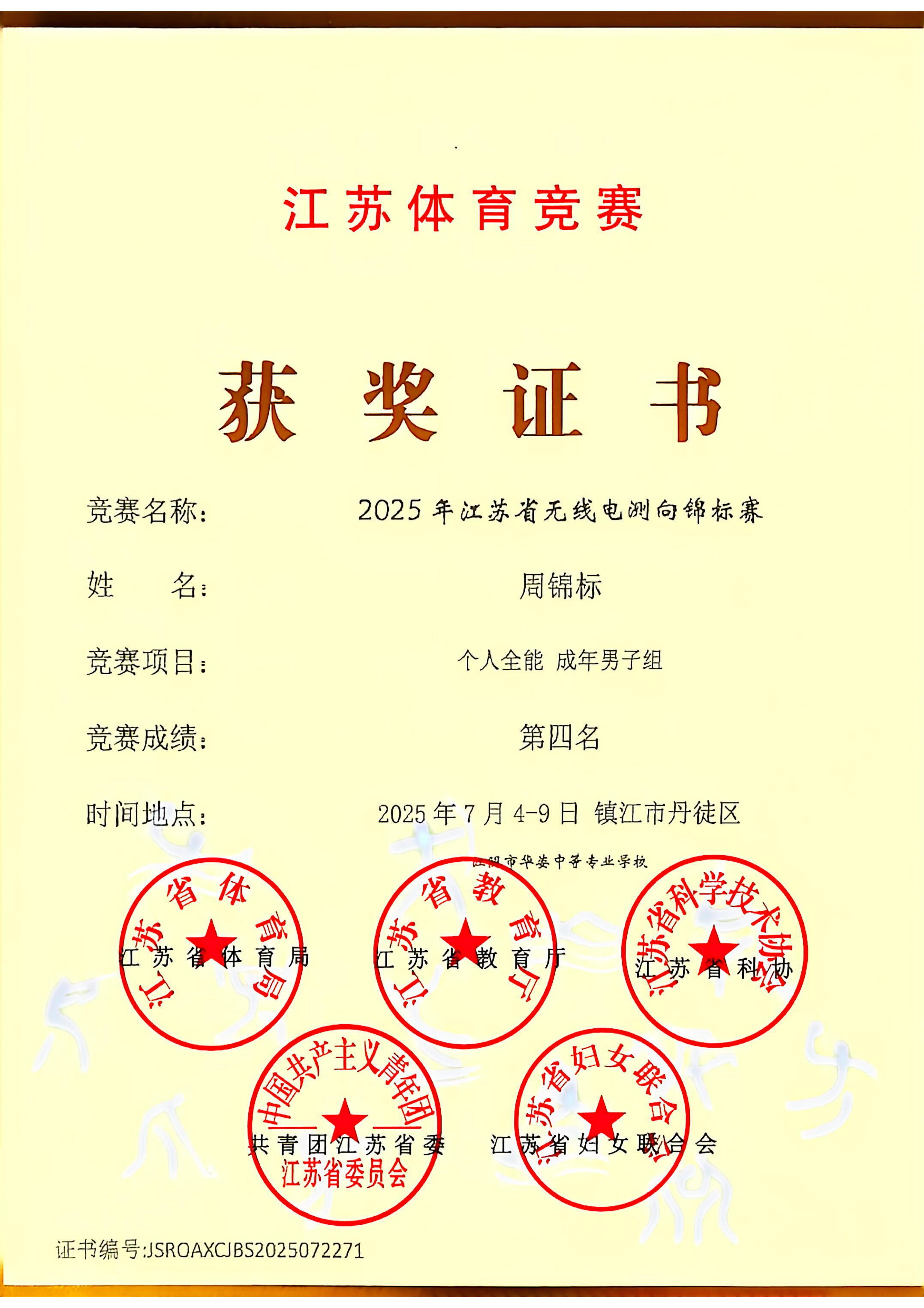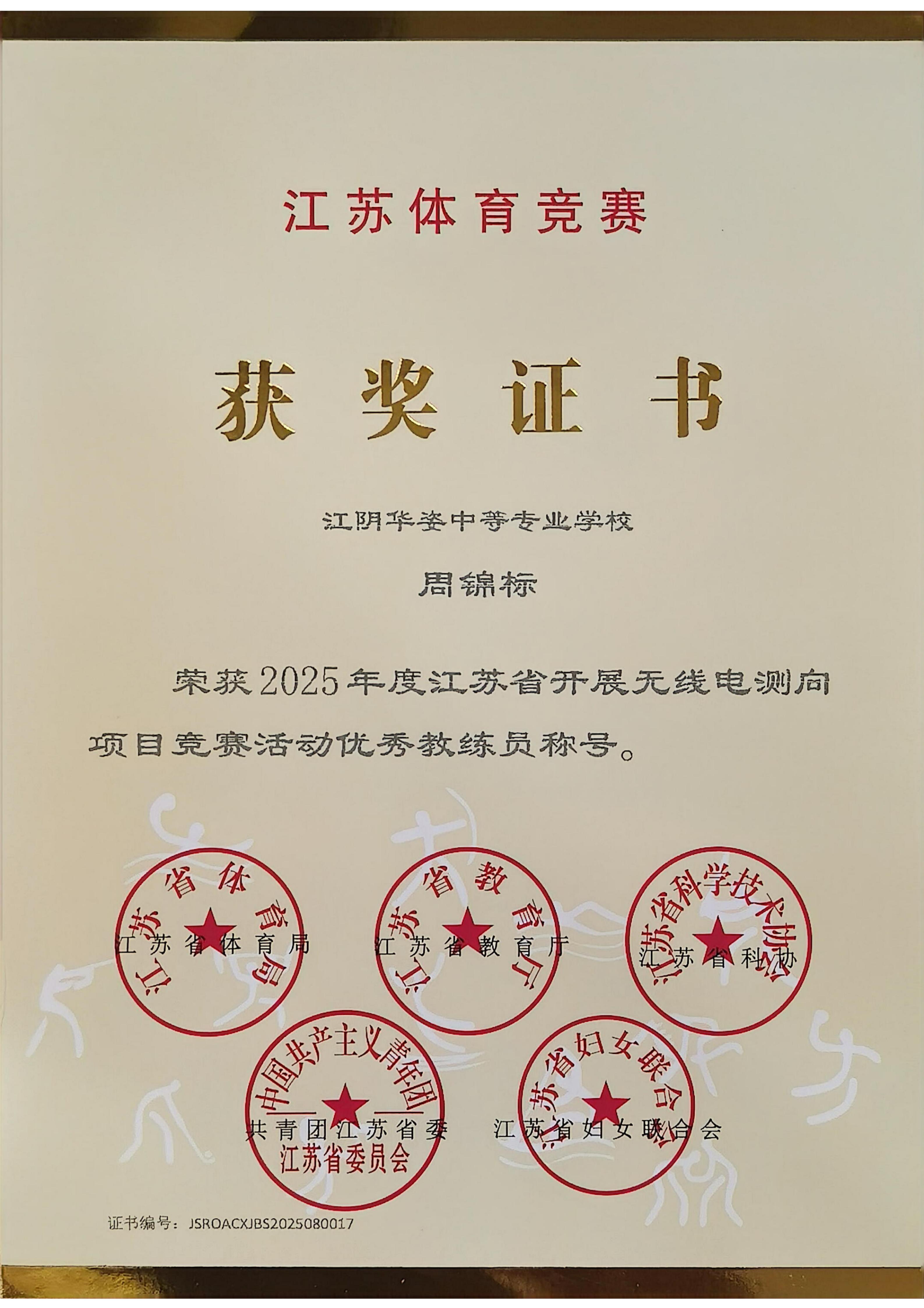 周锦标老师在2025年江苏省无线电测向锦标赛中获奖并被评为优秀指导教练