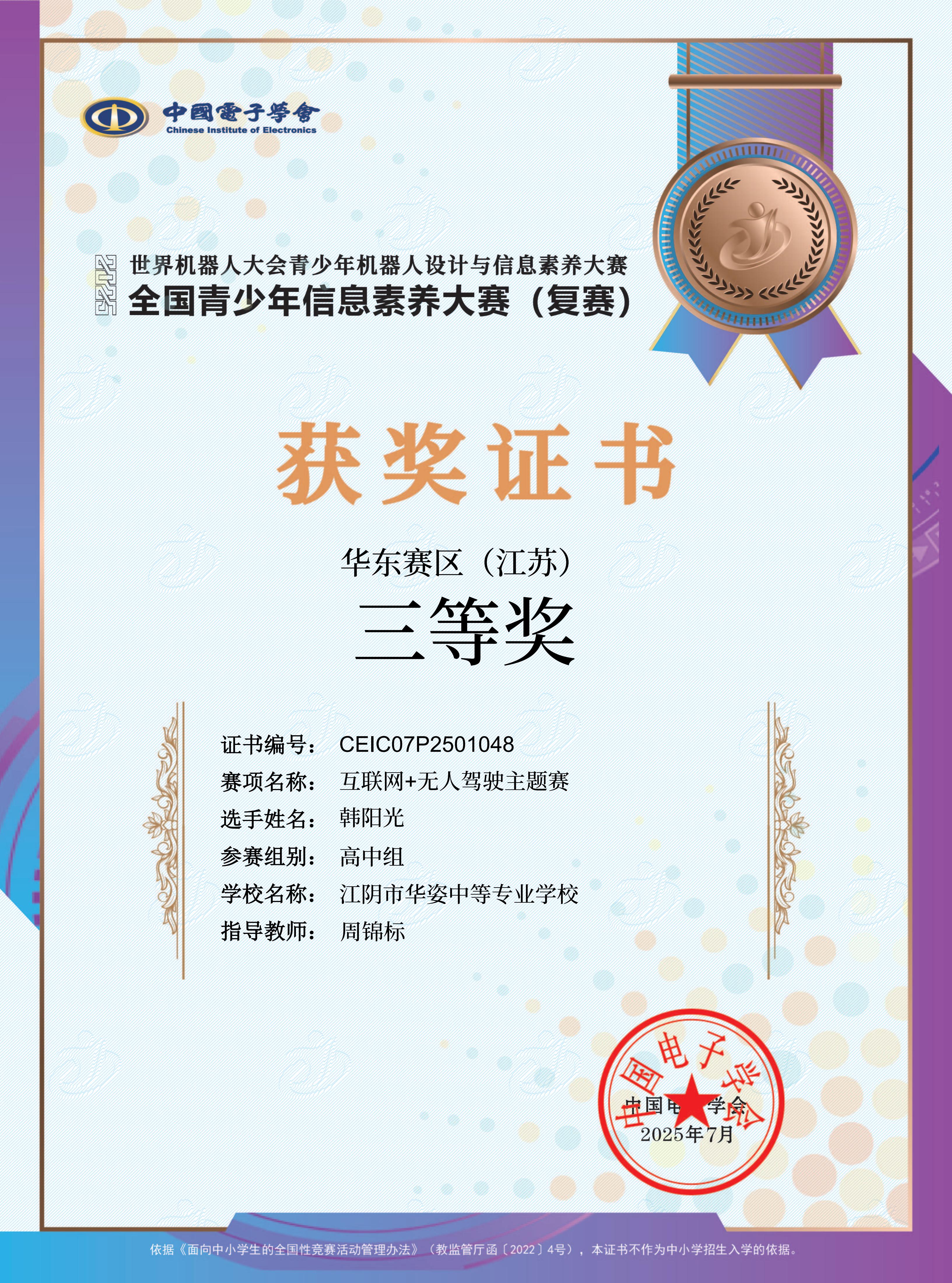 周锦标老师在全国青少年信息素养大赛(复赛)互联网+无人驾驶主题赛中指导学生获得三等奖 2025-09-25