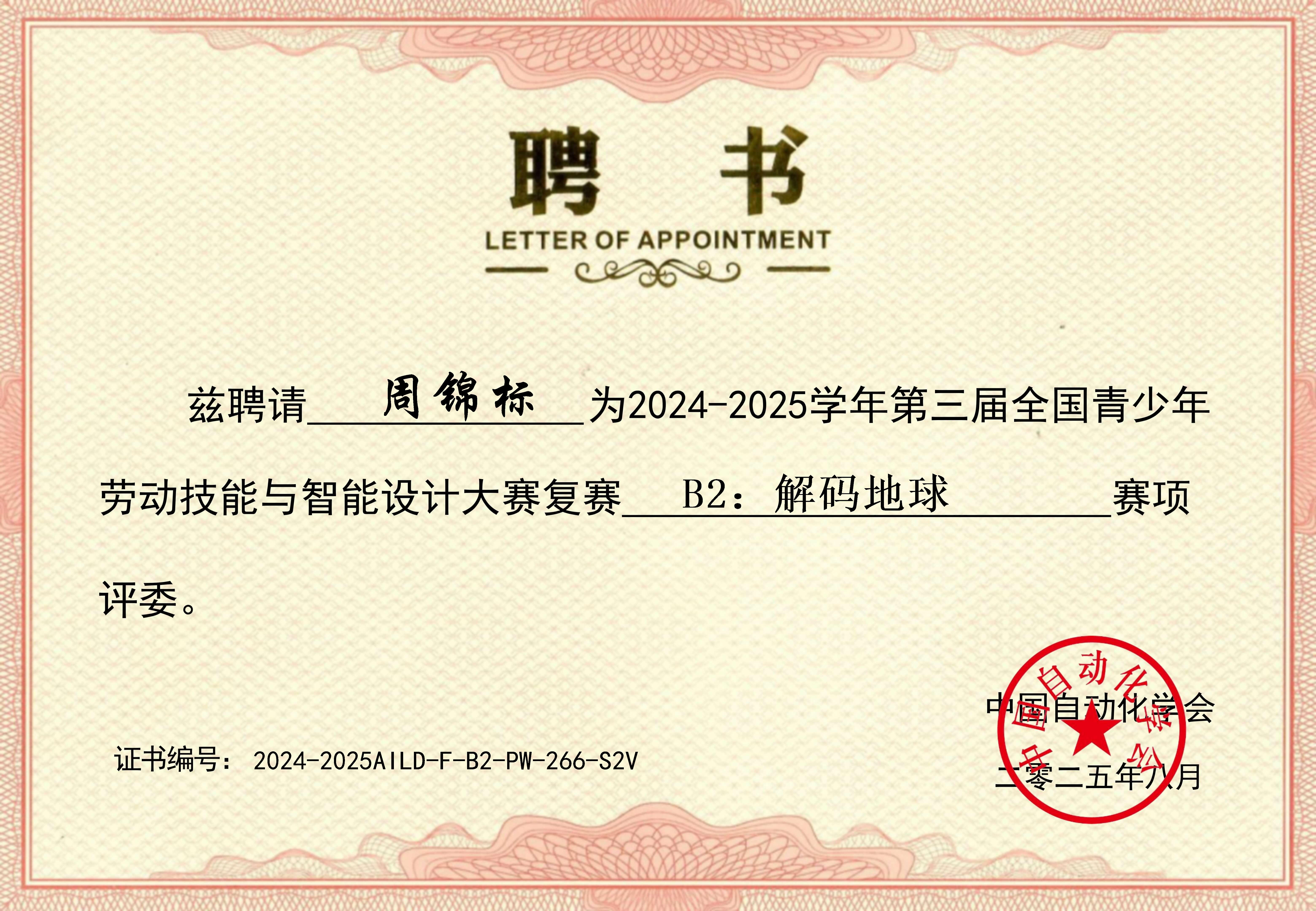 周锦标老师被聘请为2024-2025学年第三届全国青少年劳动技能与智能设计大赛评委 2025-09-25