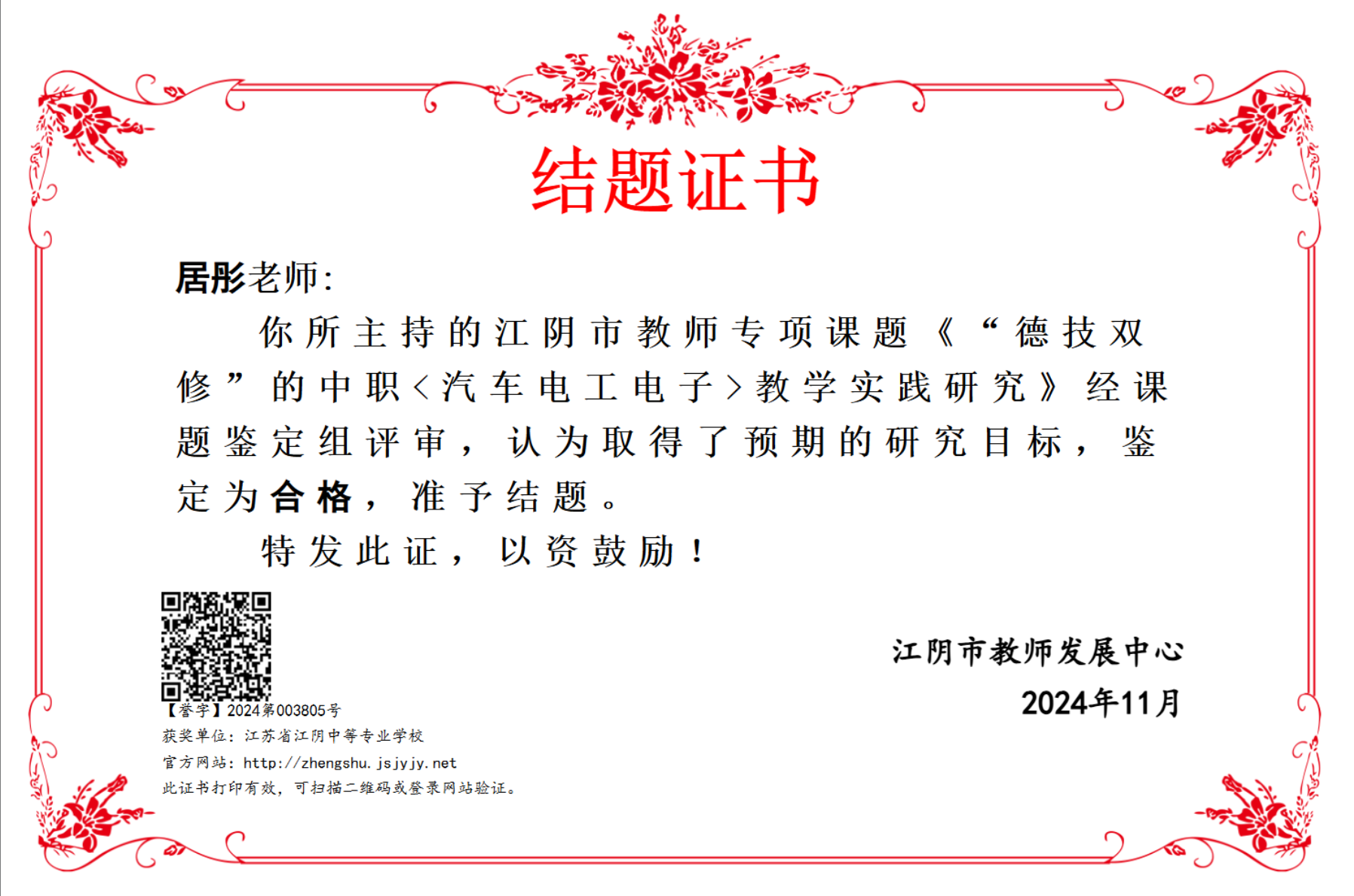 居彤老师的专项课题《“德技双修"的中职<汽车电工电子>教学实践研究》成功结题