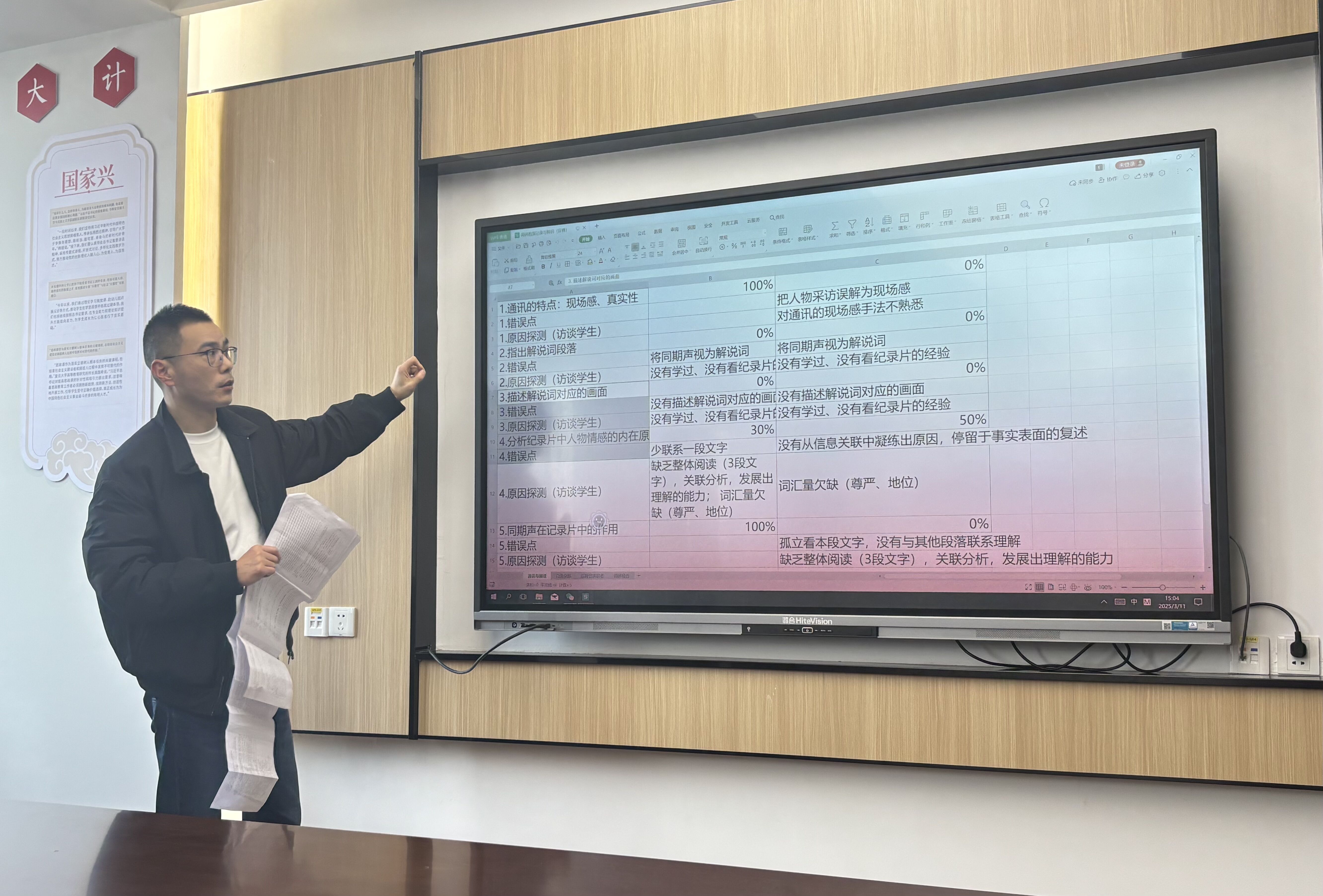 接下来,工作室成员代表就近期参加的教研、培训活动分享了他们的收获与思考。胡炯老师就2月份参加的无锡市中职语文教学调研活动,展示了调研活动的研讨资料,并结合他在职教高考教学实践中的经验,与大家分享了他对今后教学实施路径的几点思考。