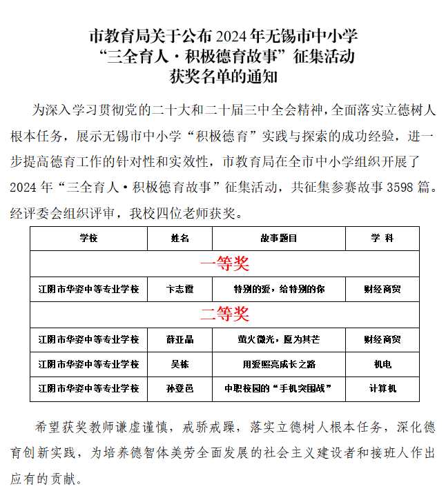 卞志霞老师在2024年无锡市中小学“三全育人·积极德育故事”征集活动获一等奖