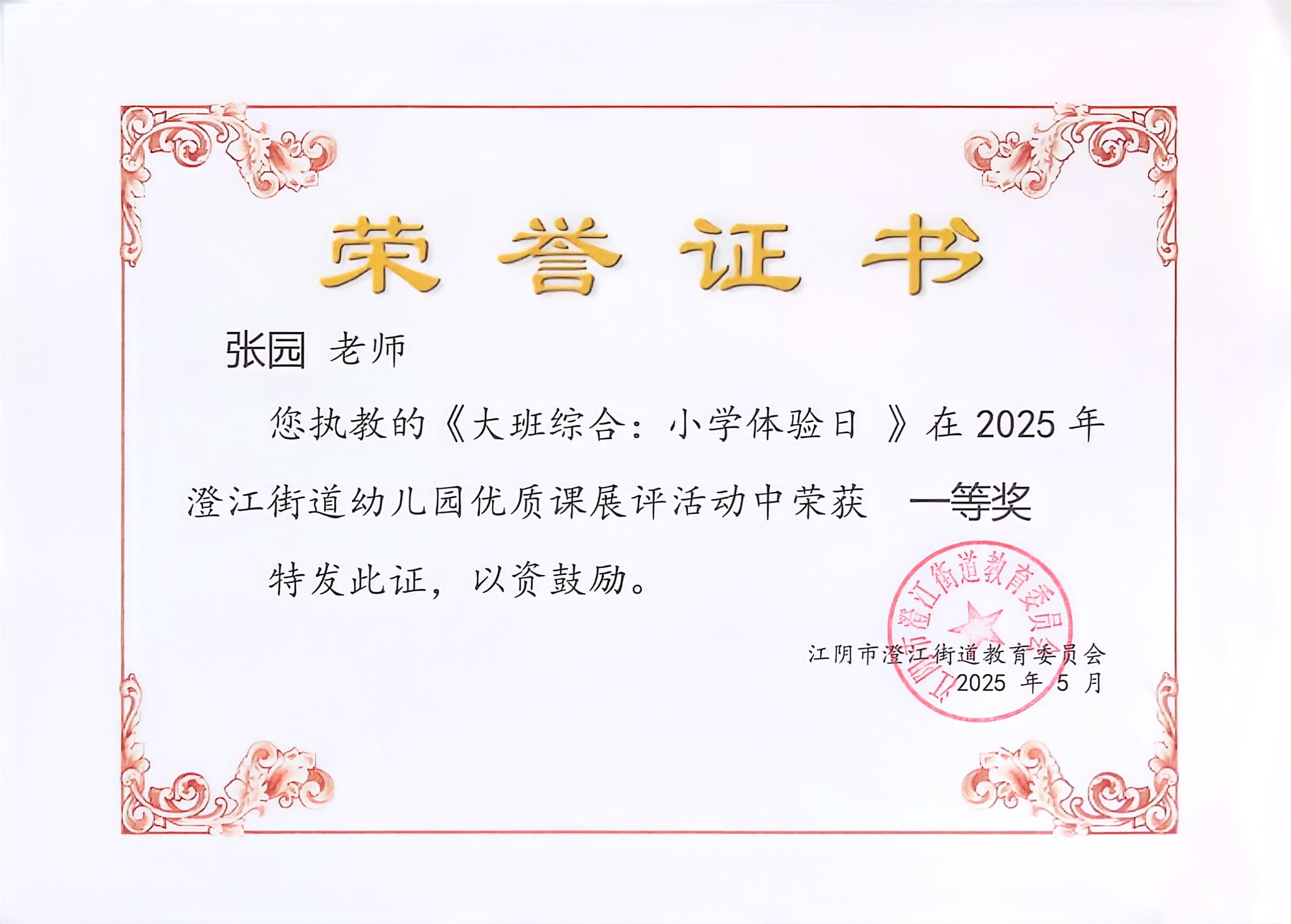 张园《大班综合:小学体验日》获澄江街道幼儿园优质课一等奖