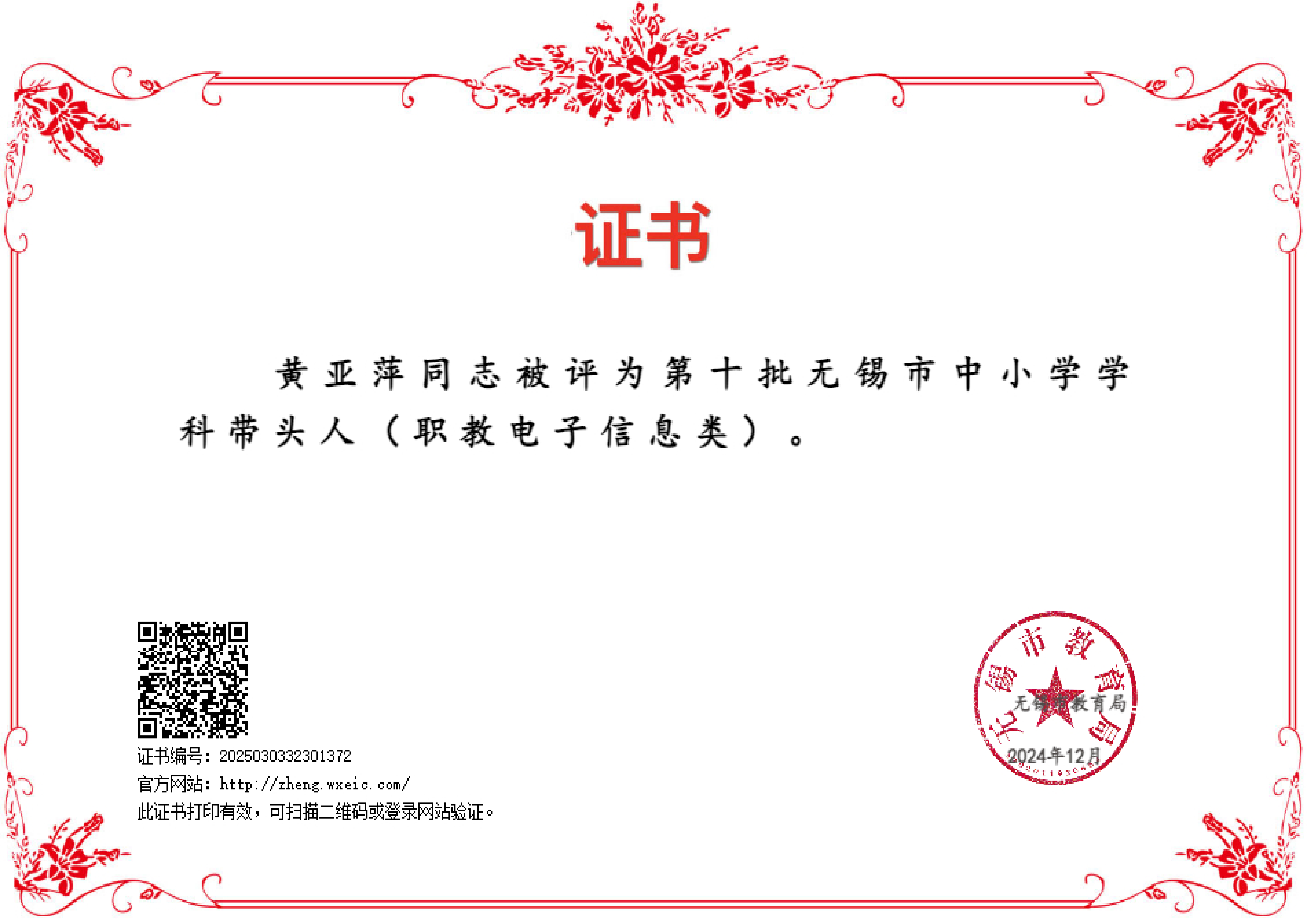 黄亚萍老师被评为第十批无锡市中小学学科带头人(职教电子信息类) 2025-09-26