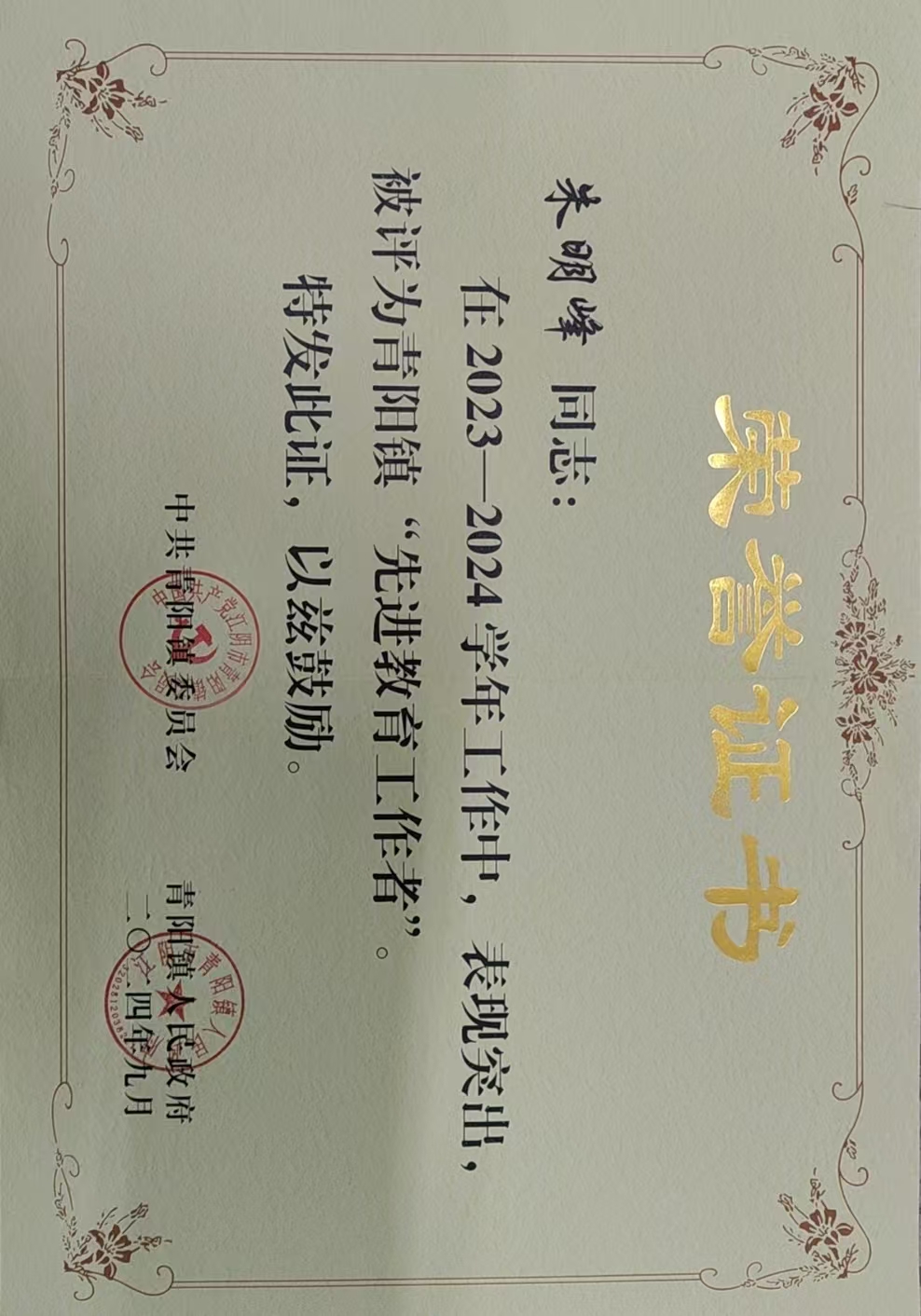 朱明峰老师在2023-2024学年工作中被评为青阳镇先进教育工作者