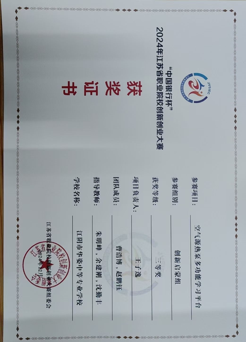 朱明峰老师在2024年江苏省职业院校创新创业大赛中指导学生获得三等奖 2025-09-26