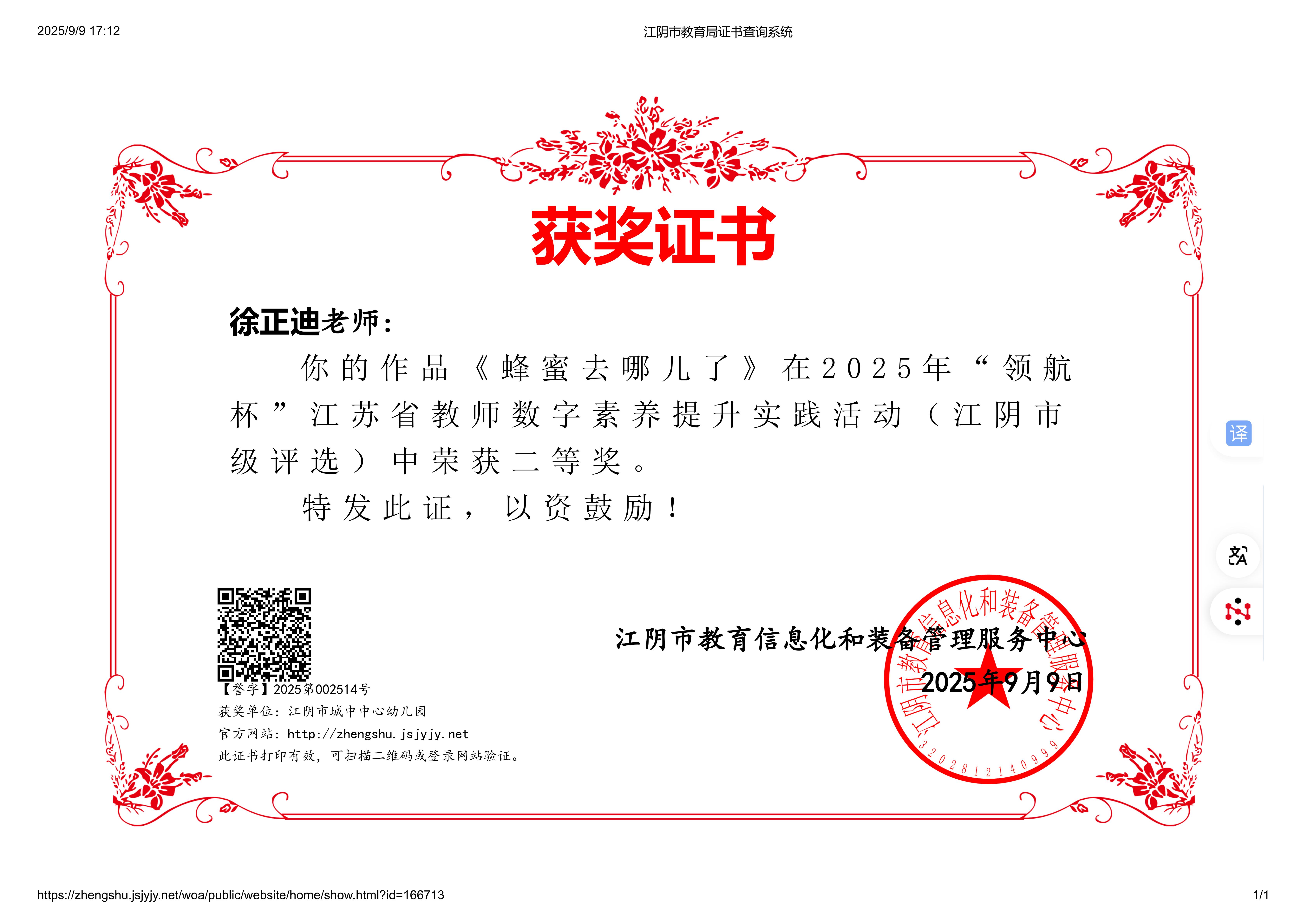 徐正迪《蜂蜜去哪儿了》获2025年“领航杯”江苏省教师数字素养提升实践活动二等奖 2025-09-26