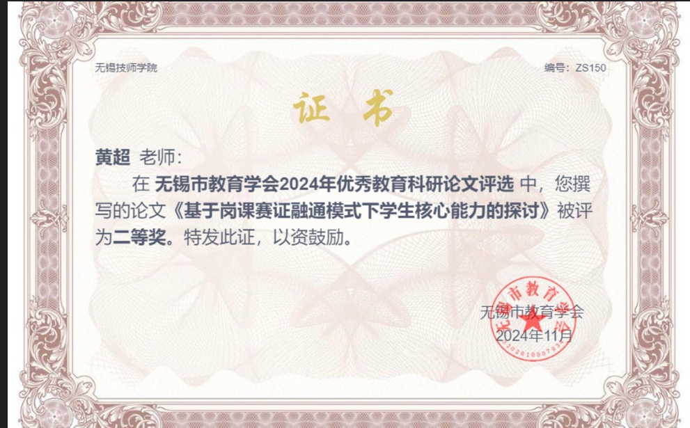 黄超2024.11论文《基于岗课赛证融通模式下学生核心能力的探讨》无锡二等奖 2025-09-26