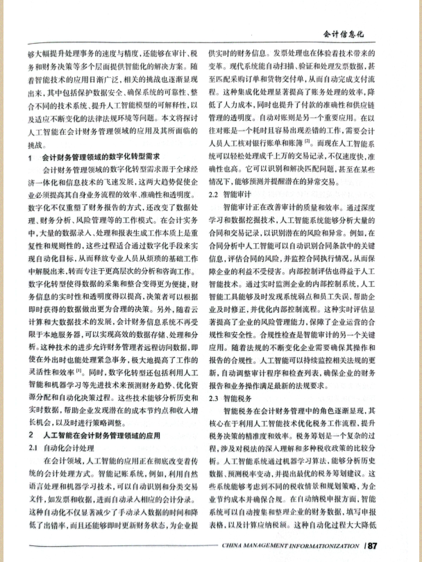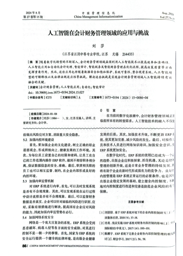 刘莎2024.8论文《人工智能在会计财务管理领域应用与挑战》发表《中国管理信息化》