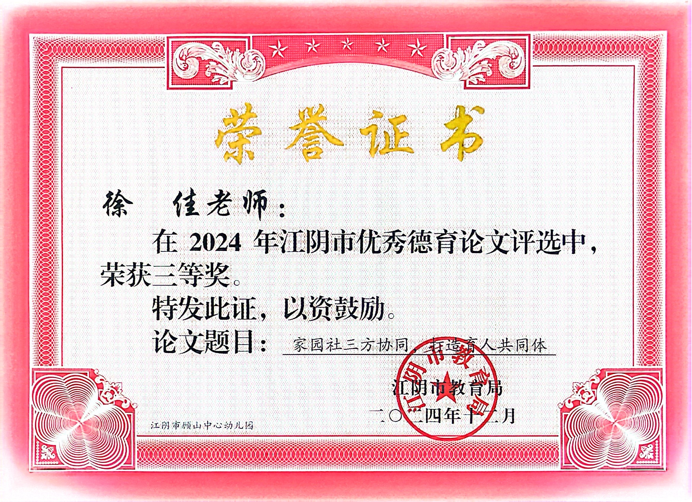 徐佳《家园社三方协同,打造育人共同体》发表于江阴市德育论文荣获三等奖