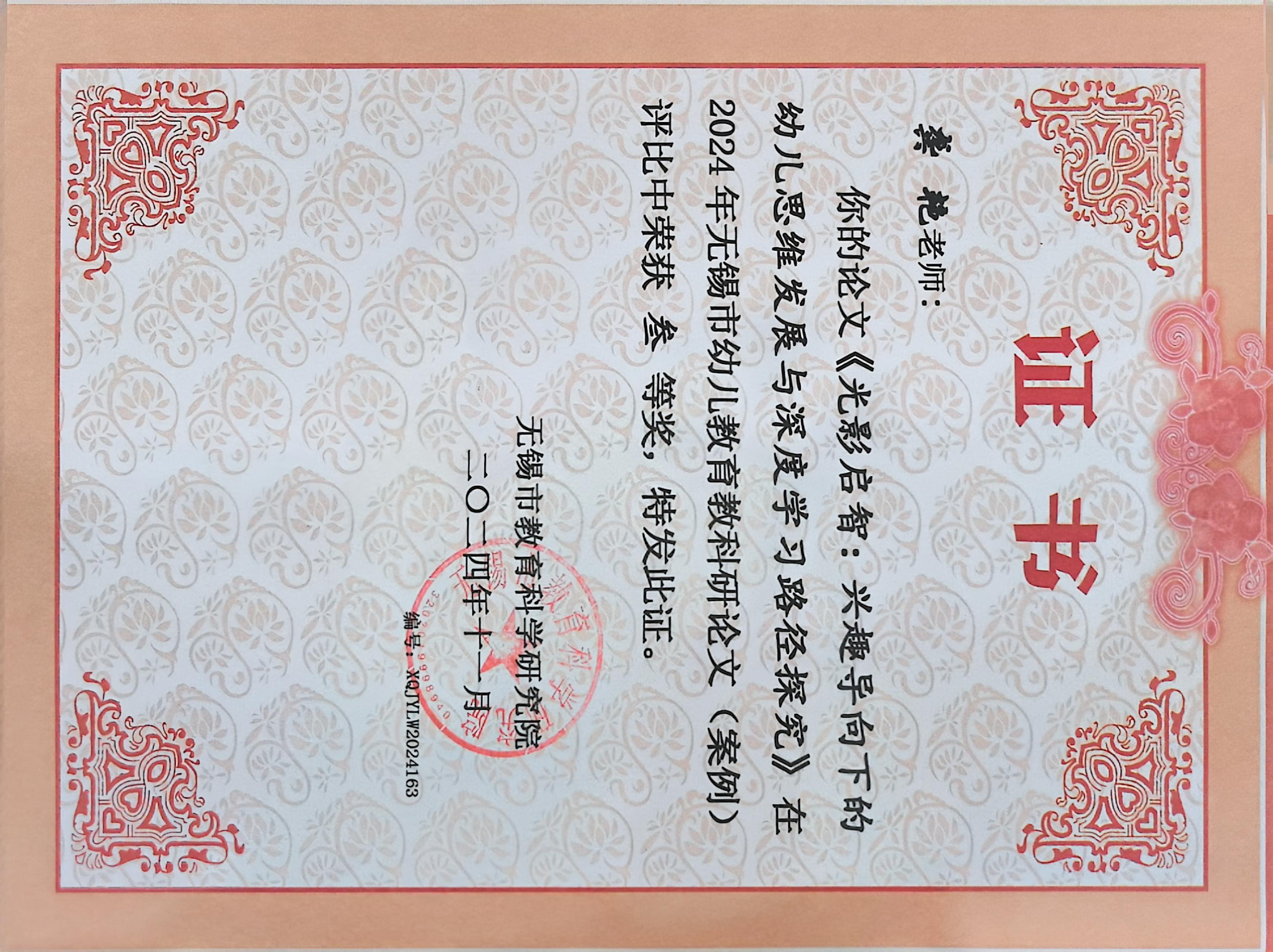 龚艳论文获《光影启智:兴趣导向下的幼儿思维发展与深度学习路径探究》无锡市教育科学研究院三等奖