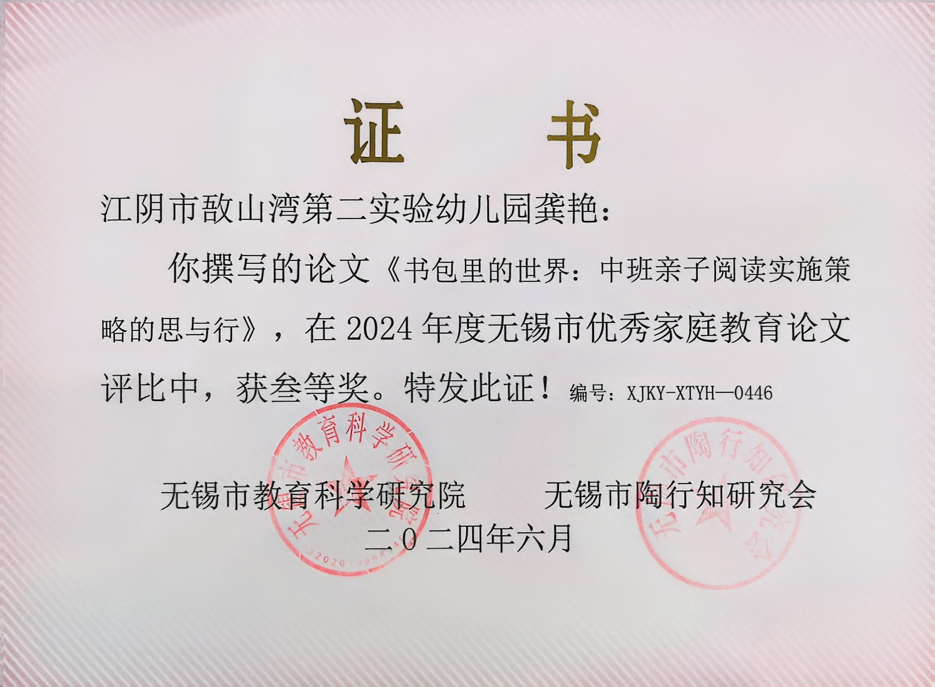 龚艳论文《书包里的世界:中班亲子阅读实施策略的思与行》获无锡市教育科学研究院三等奖
