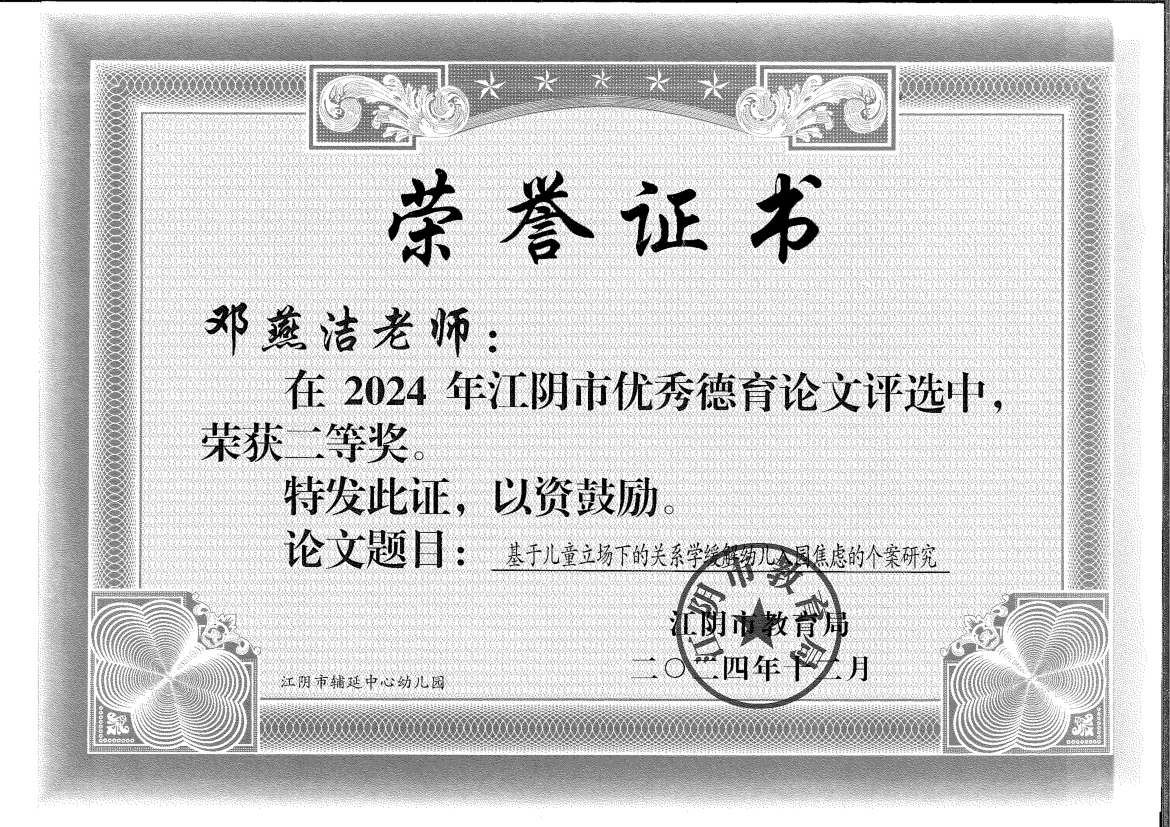 邓燕洁论文《基于儿童立场下的关系学缓解幼儿园入园焦虑的个案研究》获江阴市德育论文二等奖 2025-09-26