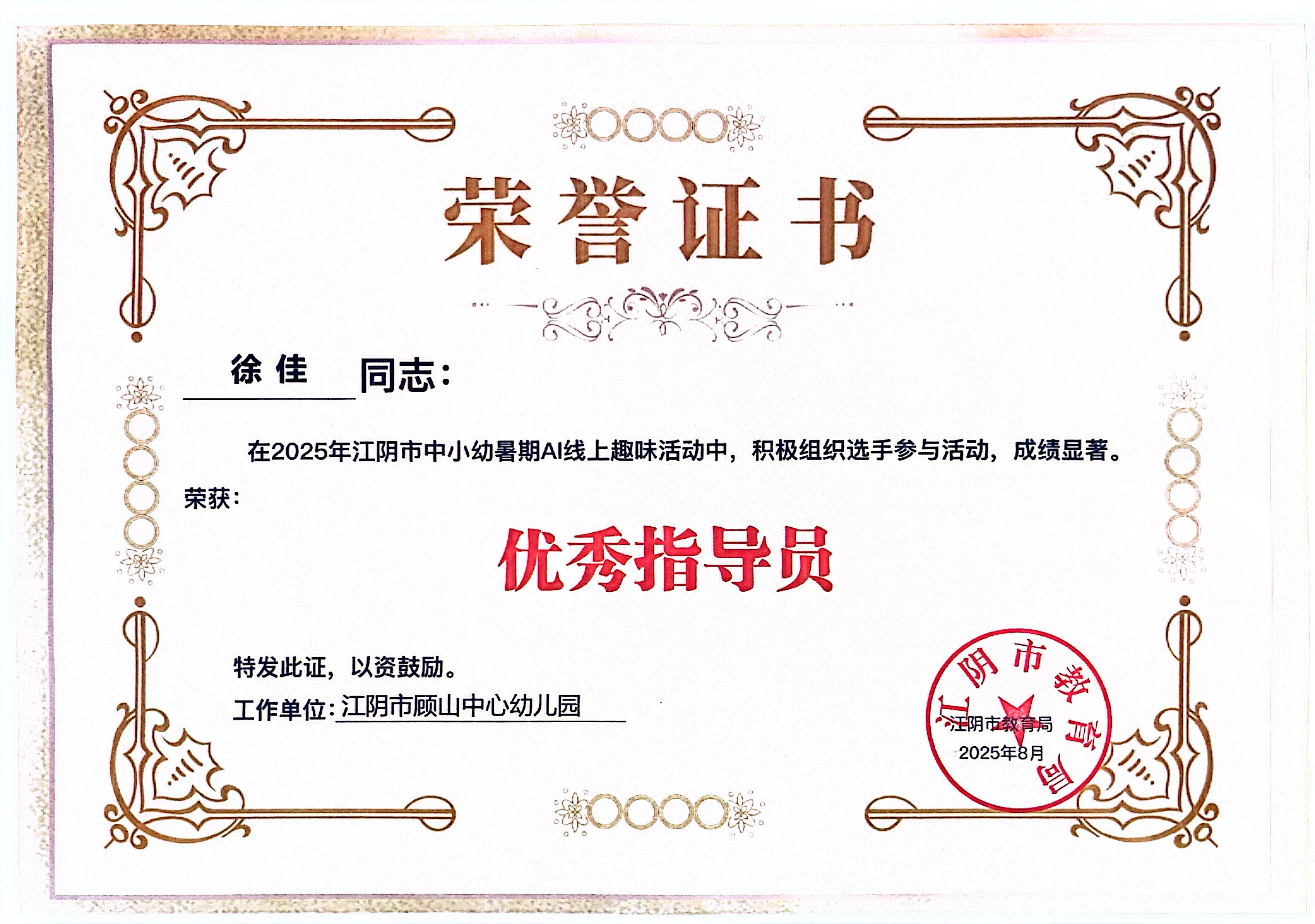 徐佳:江阴市中小幼AI暑期趣味活动获“优秀指导员”称号