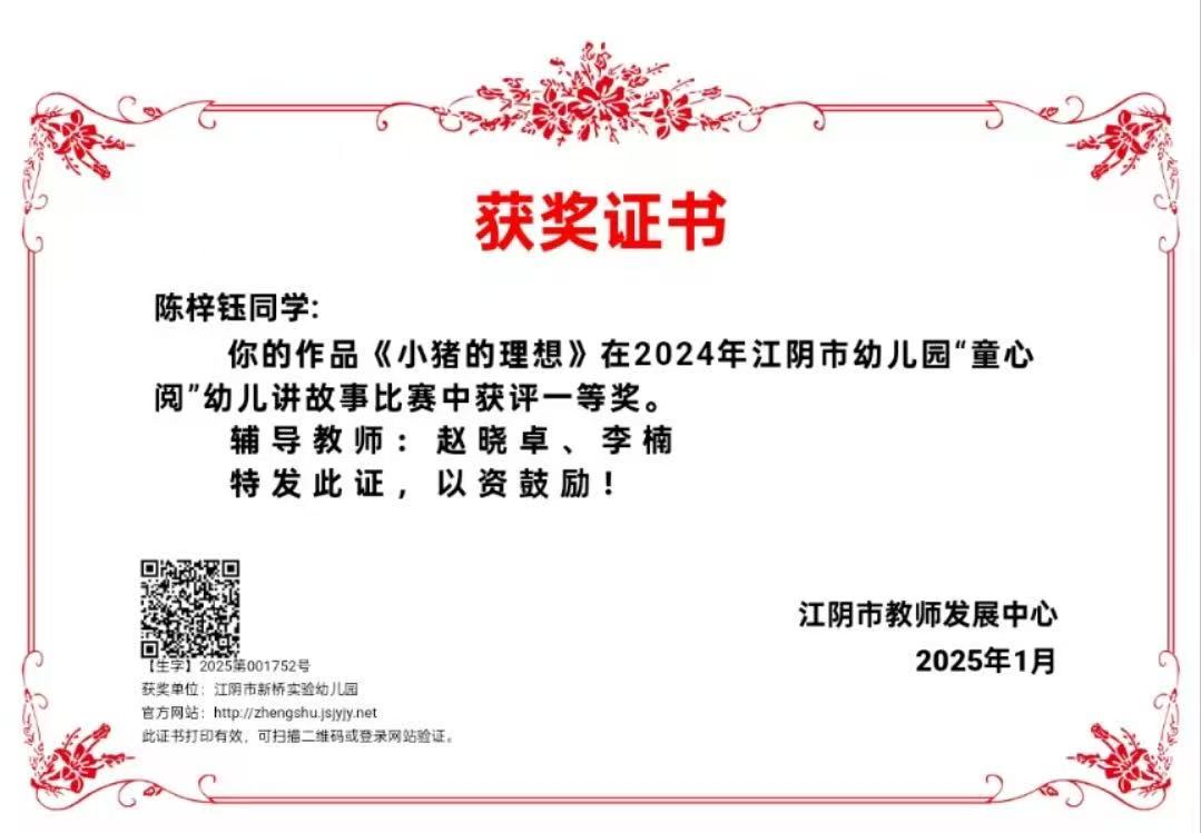 赵晓卓:辅导幼儿参加江阴市“童心阅”讲故事比赛获一等奖