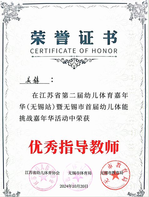 吴静:辅导幼儿参加无锡市幼儿体能挑战嘉年华获优秀指导奖