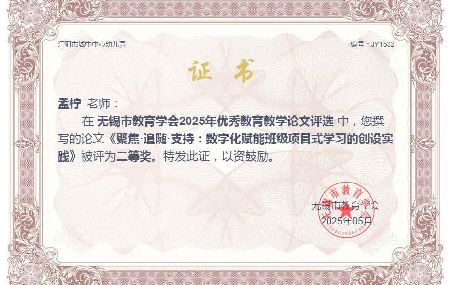 孟柠:论文《聚焦·追随·支持》获无锡教育学会二等奖