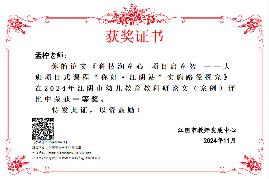 孟柠:论文《科技润童心 项目启童智》获江阴市教师发展中心一等奖