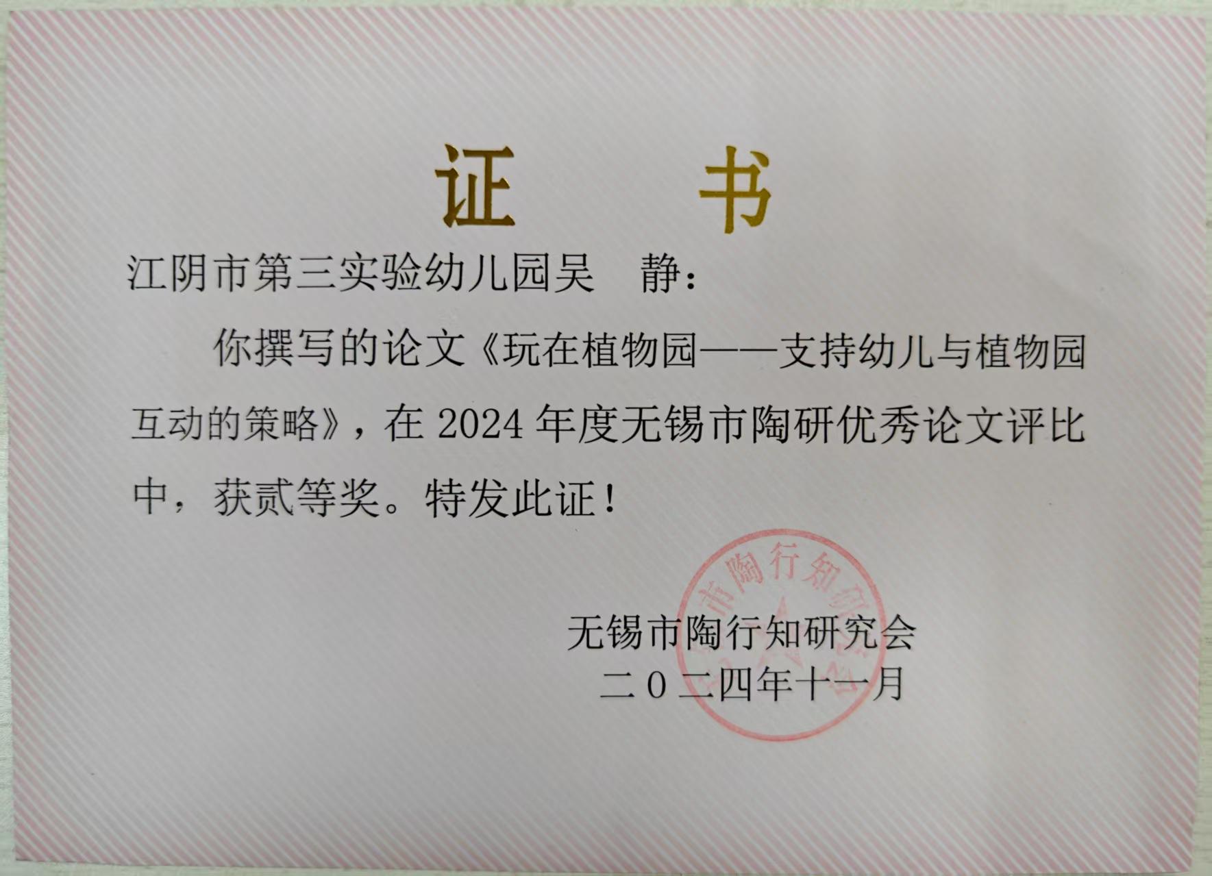 吴静:论文《玩在植物园——支持幼儿与植物园互动的策略》获无锡市二等奖