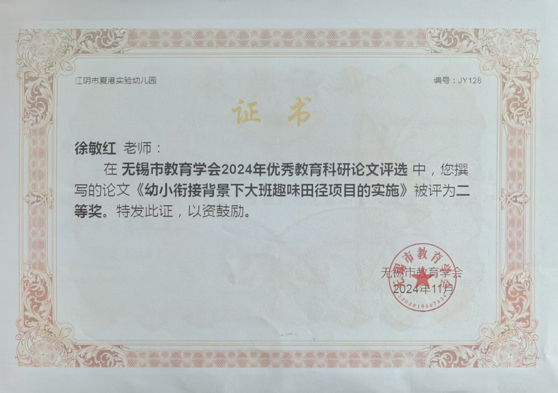 徐敏红:论文《幼小衔接背景下大班趣味田径项目的实施》获无锡市二等奖