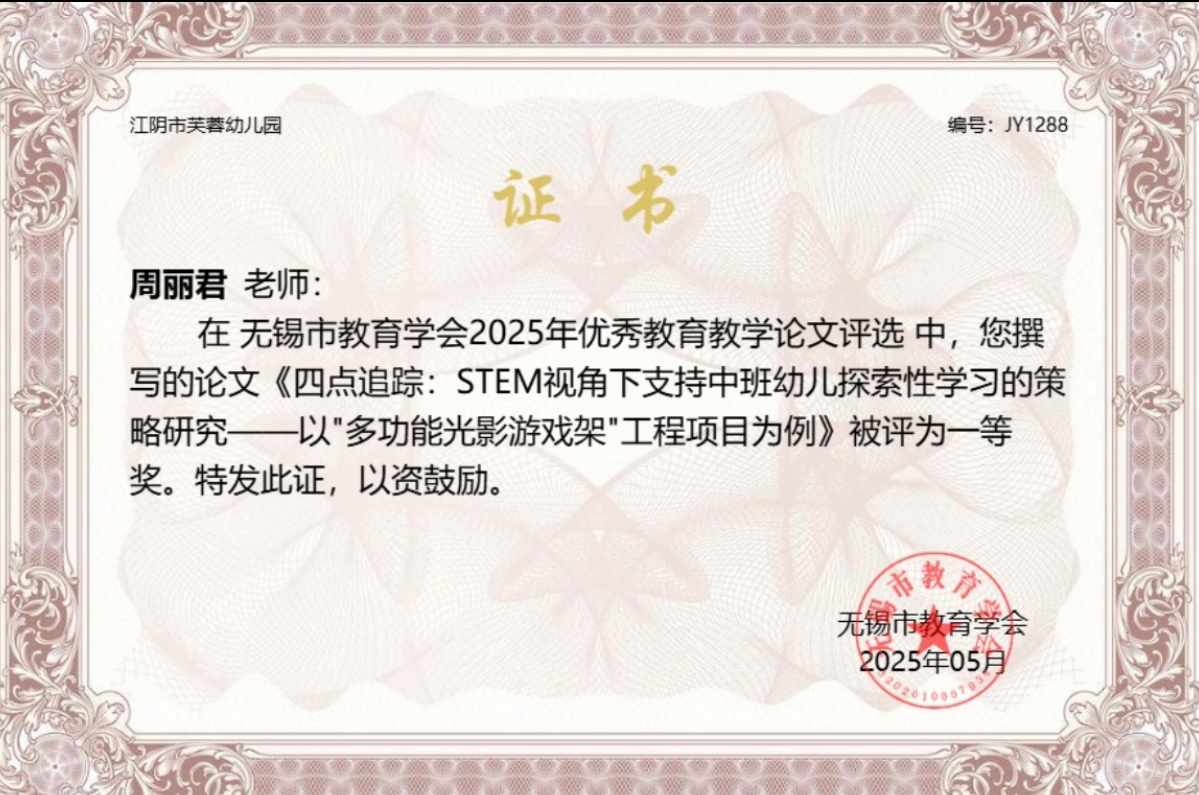 周丽君:论文《四点追踪:STEM视角下支持中班幼儿探究性学习的策略研究》获无锡市一等奖