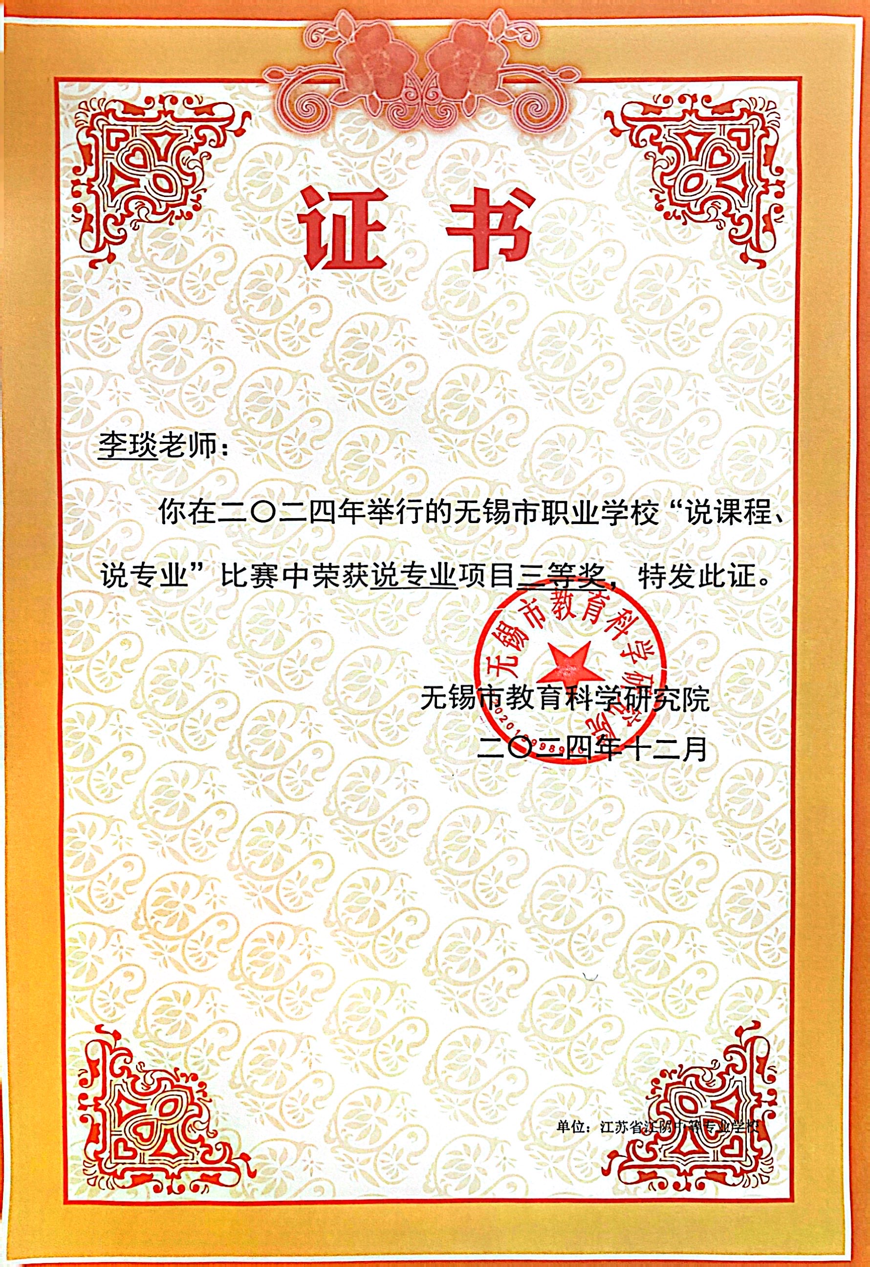 李琰获得无锡市“说专业”比赛三等奖 2025-09-28
