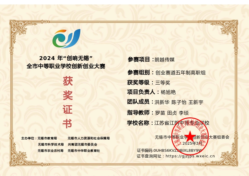 李琰指导学生获得无锡市创新创业大赛三等奖
