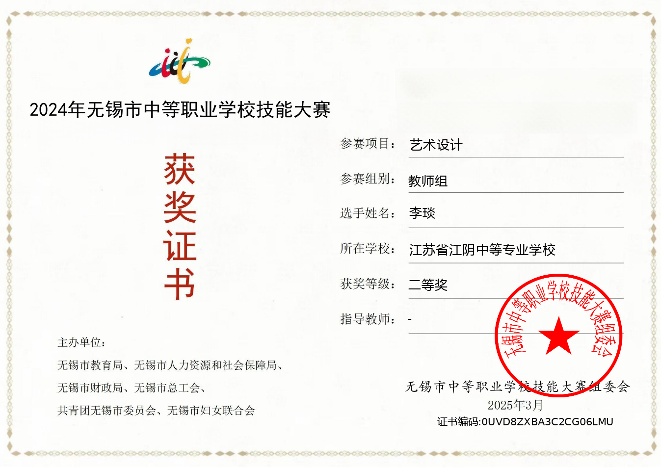 李琰获得无锡市技能大赛二等奖 2025-09-28