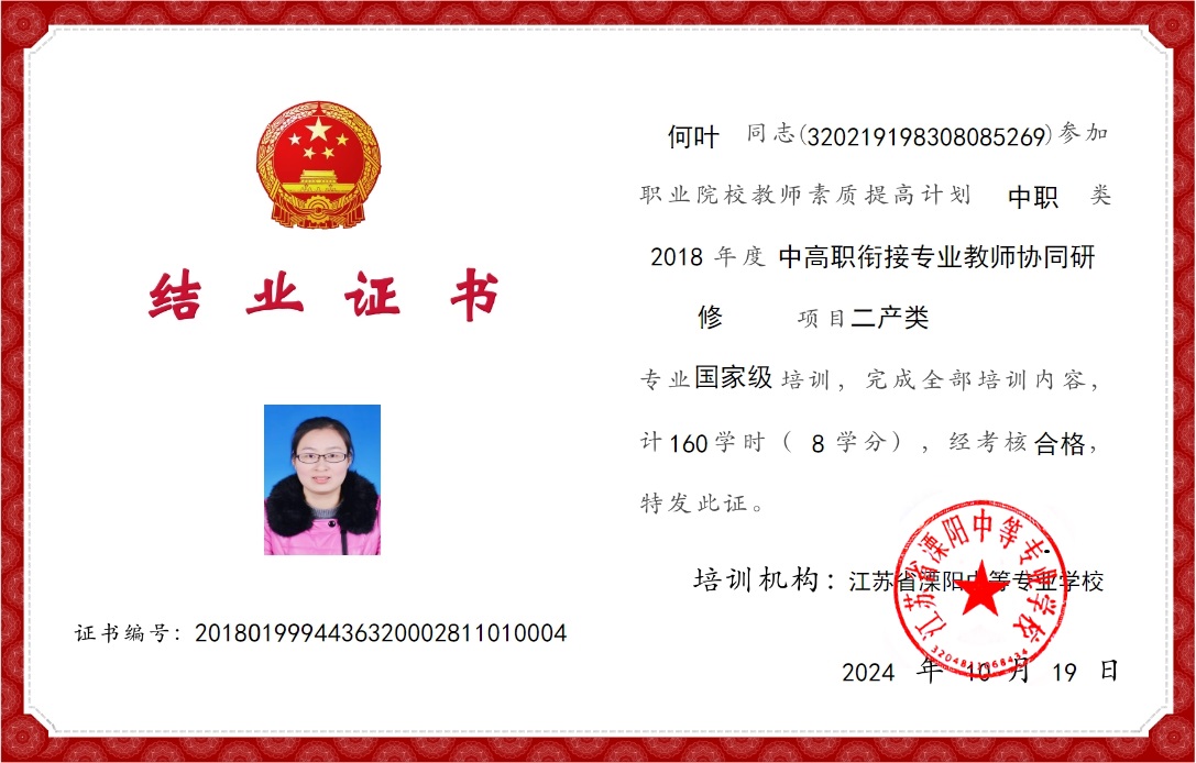 何叶老师参加的2018年中高衔接专业教师协同研修项目二产类专业国家级培训顺利结业