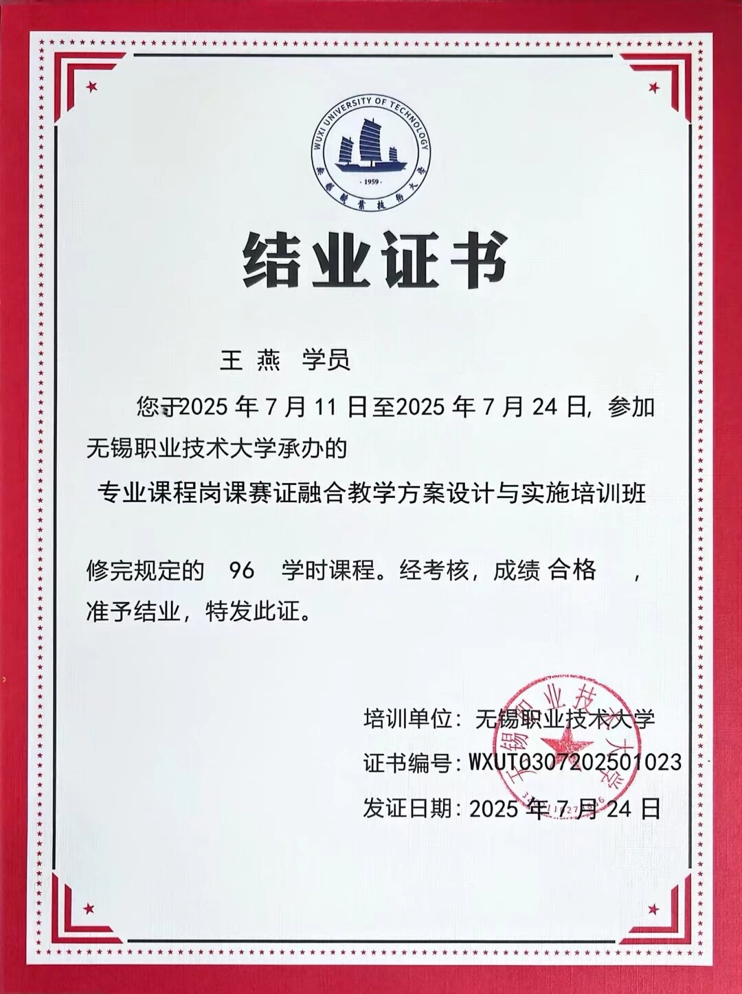 王燕老师参加了无锡职业技术大学承办的专业课程岗课赛证融合教学方案设计与实施培训班