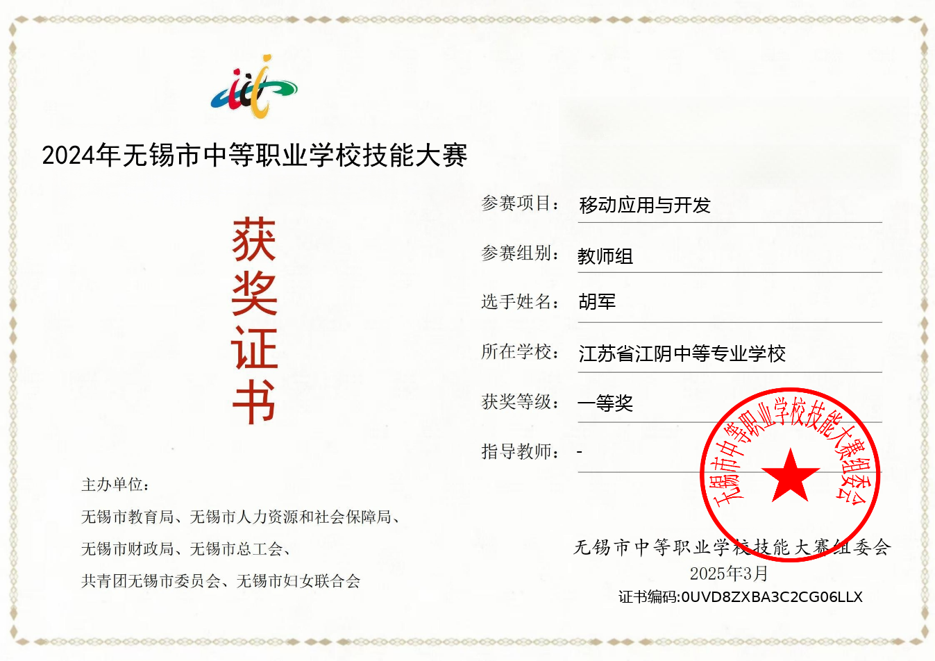 胡军老师获无锡市职业院校技能比赛教师组一等奖