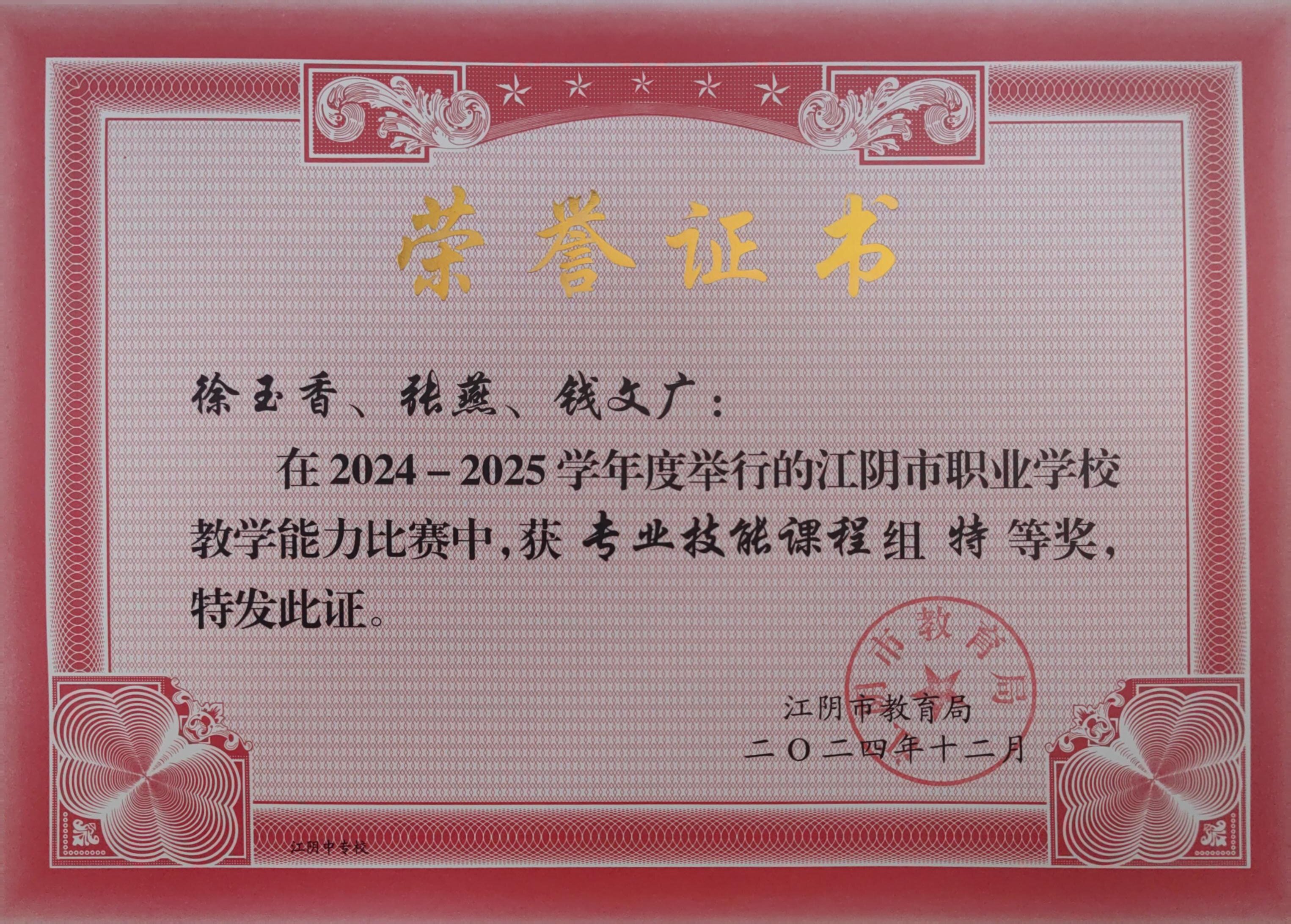 徐玉香、张燕、钱文广:2024-2025学年度江阴市职业学校教学能力比赛专业技能课程特等奖