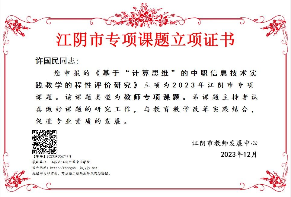 许国民老师的《基于“计算思维”的中职信息技术实践教学的程性评价研究》课题立项