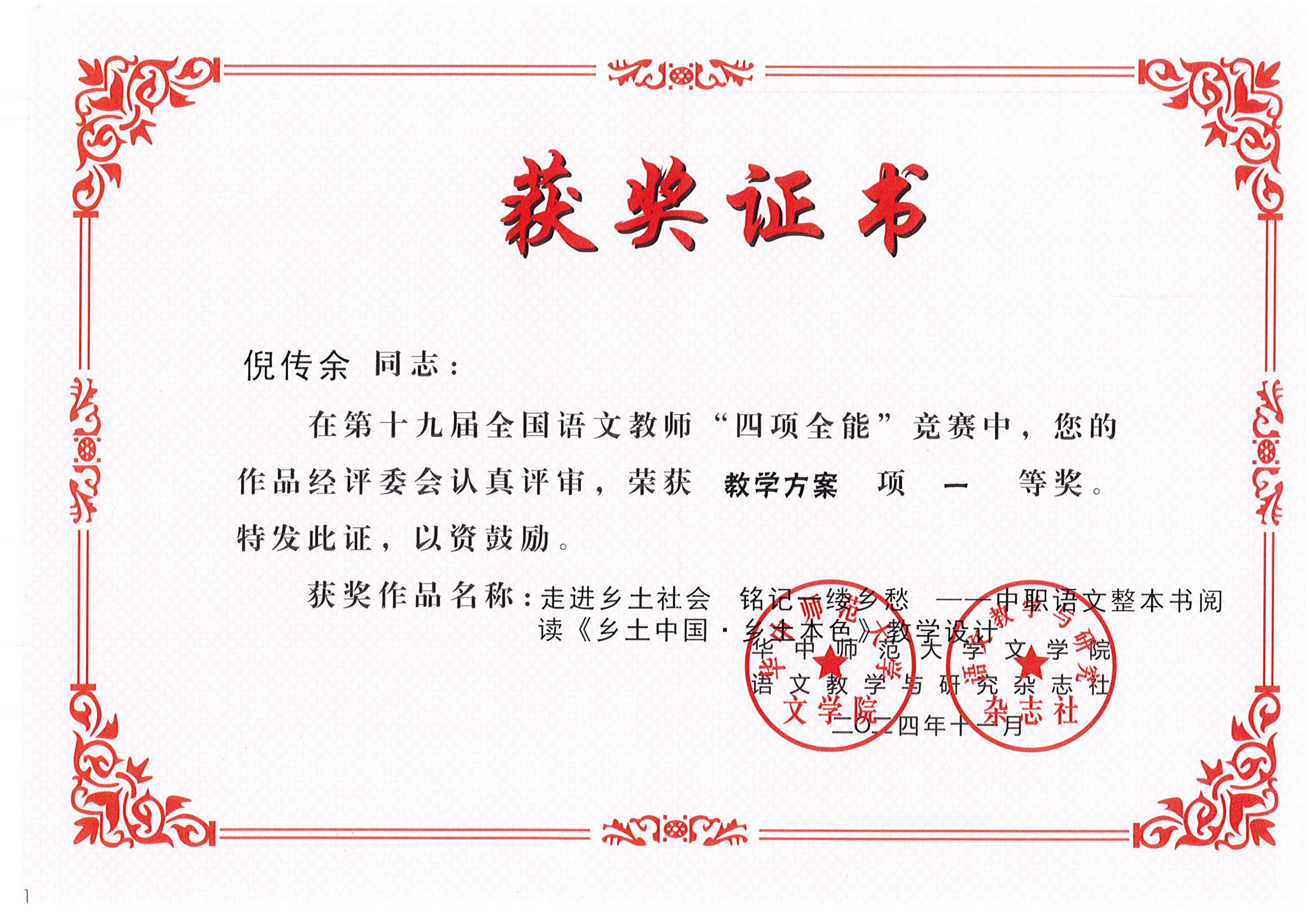 季春花名师工作室成员倪传余老师在第十九届全国语文教师“四项全能”竞赛中获教学方案项一等奖 2025-09-28