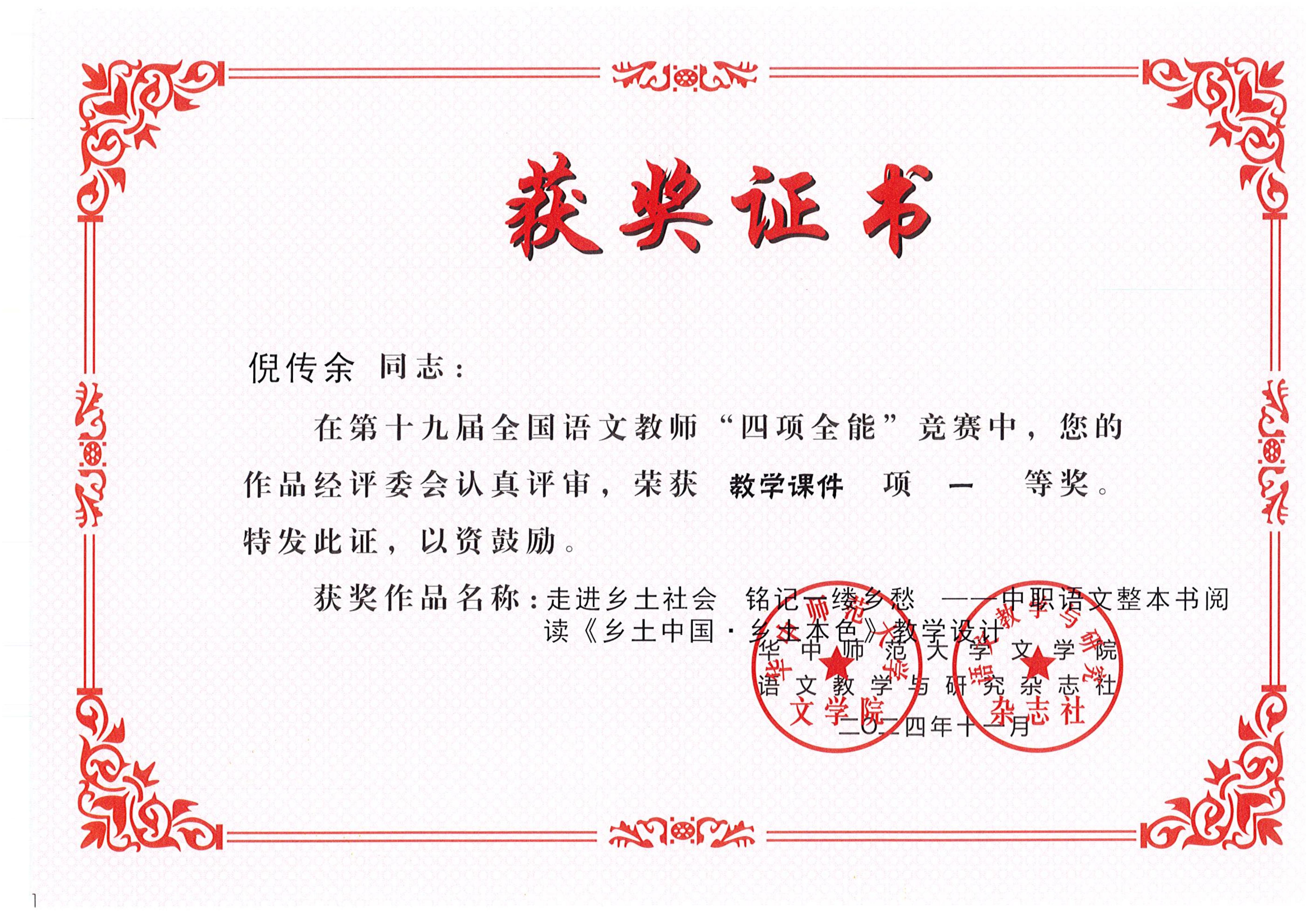 季春花名师工作室成员倪传余老师在第十九届全国语文教师“四项全能”竞赛中获教学课件项一等奖 2025-09-28