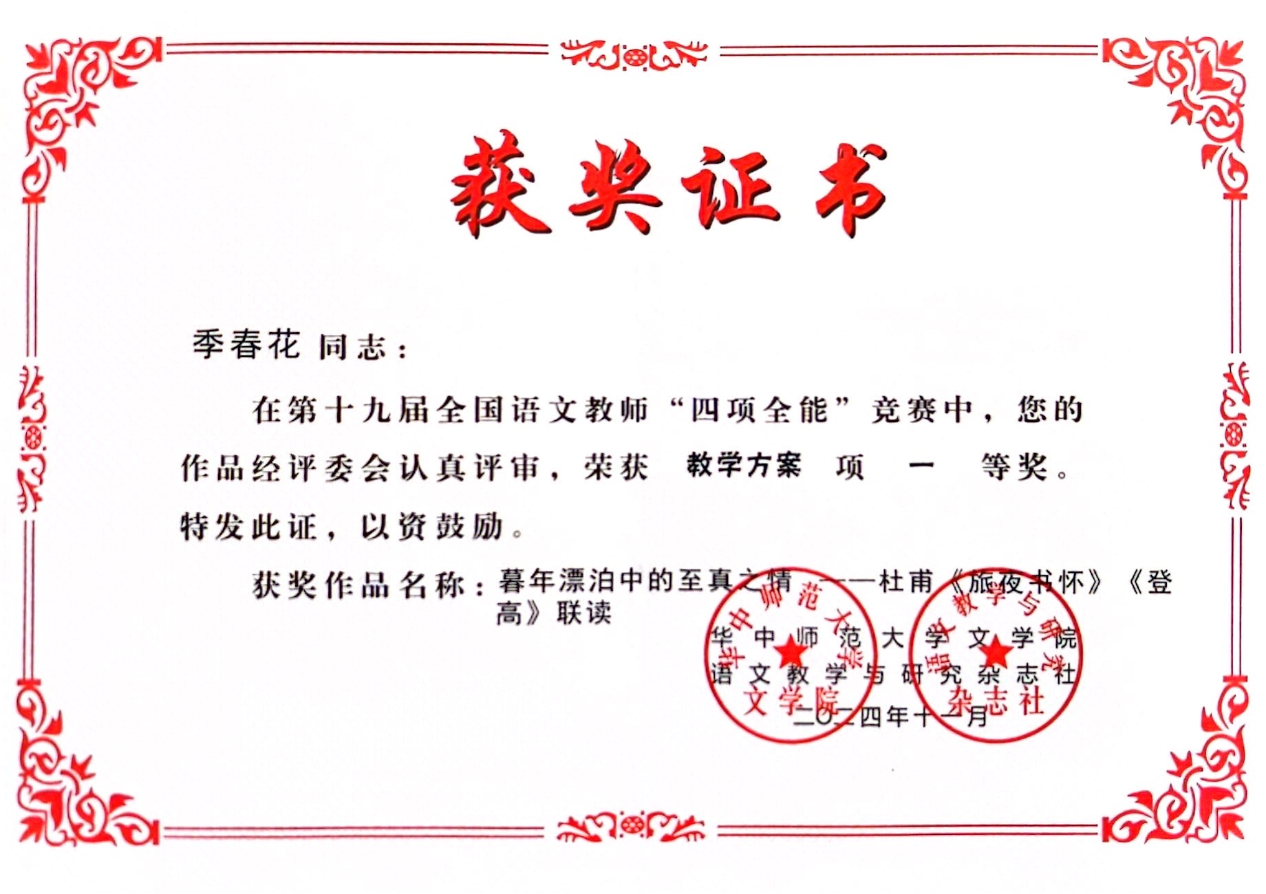 季春花老师在第十九届全国语文教师“四项全能”竞赛中获得教学方案项一等奖 2025-09-28