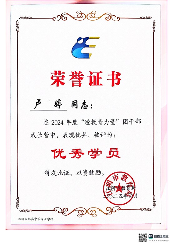 卢婷老师被评为“澄教青力量”优秀学员