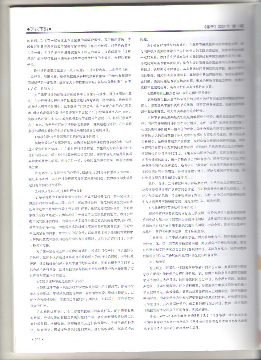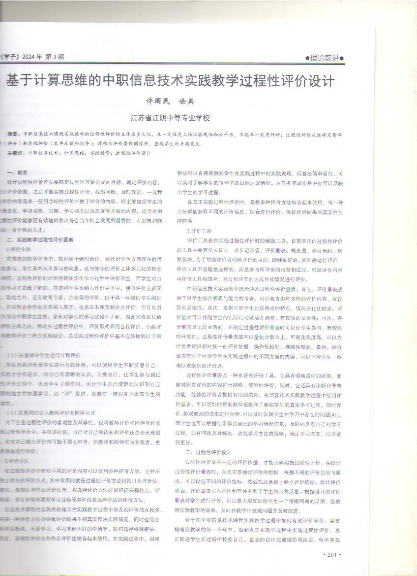 许国民老师发表的论文《基于计算思维的中职信息技术实践教学的过程性评价设计