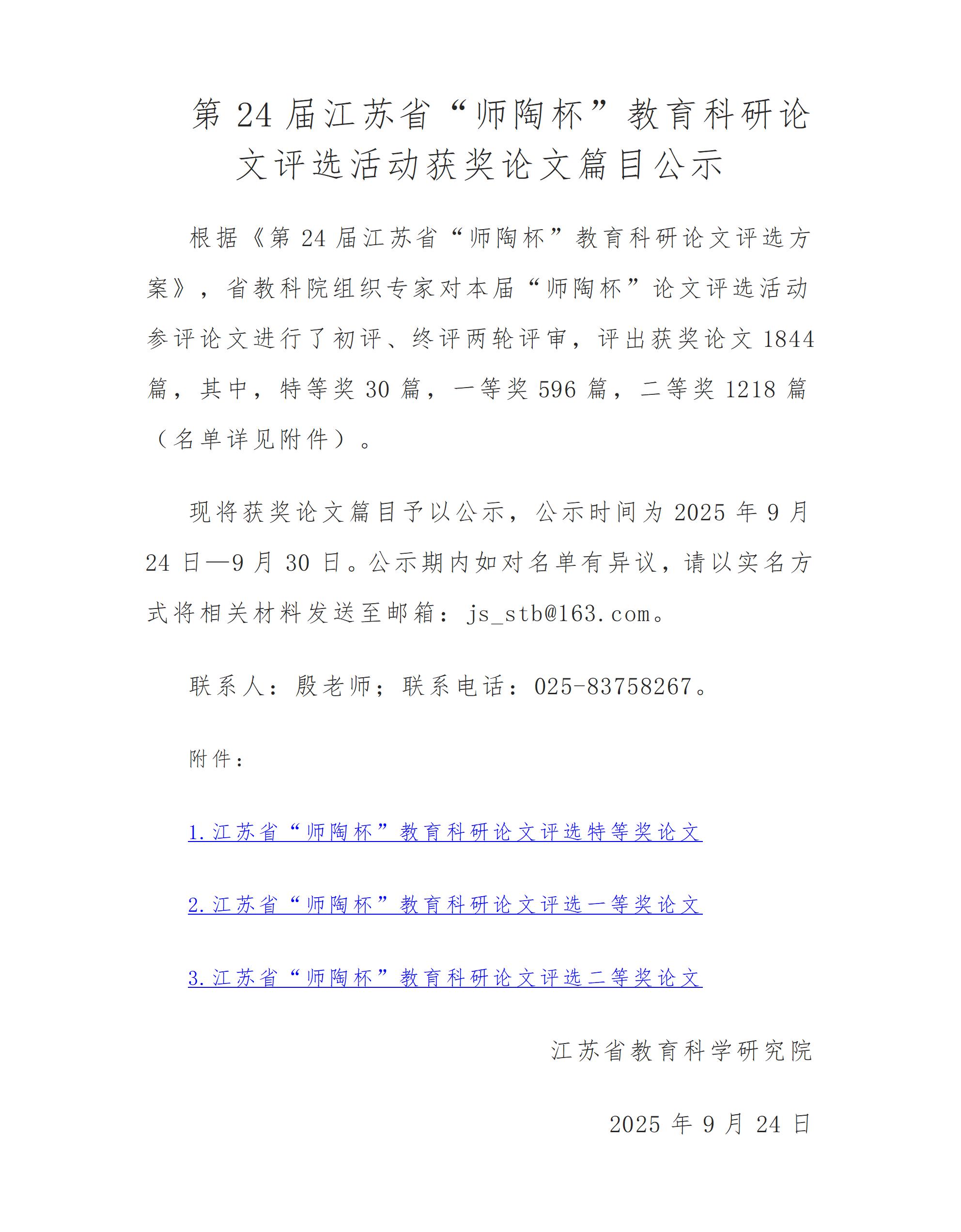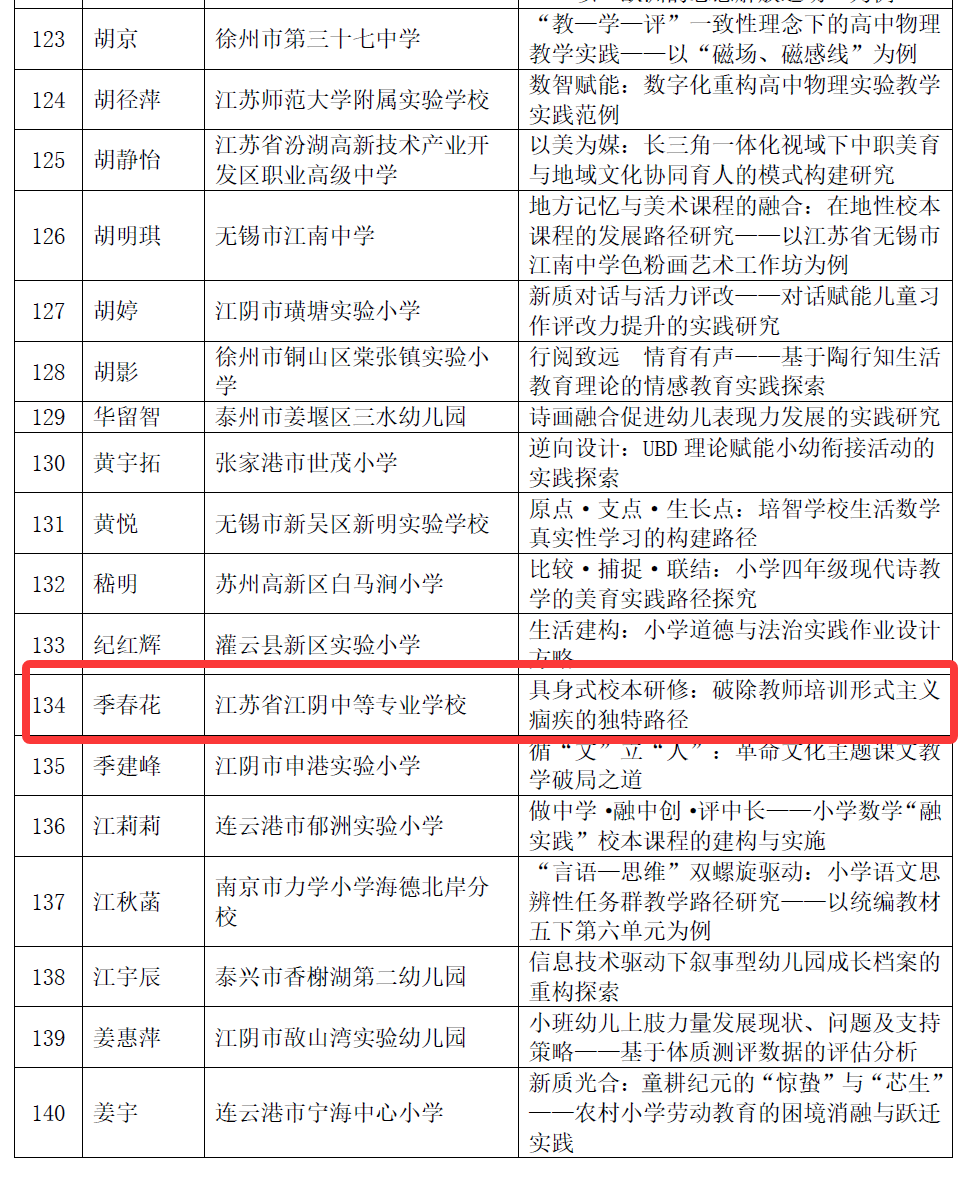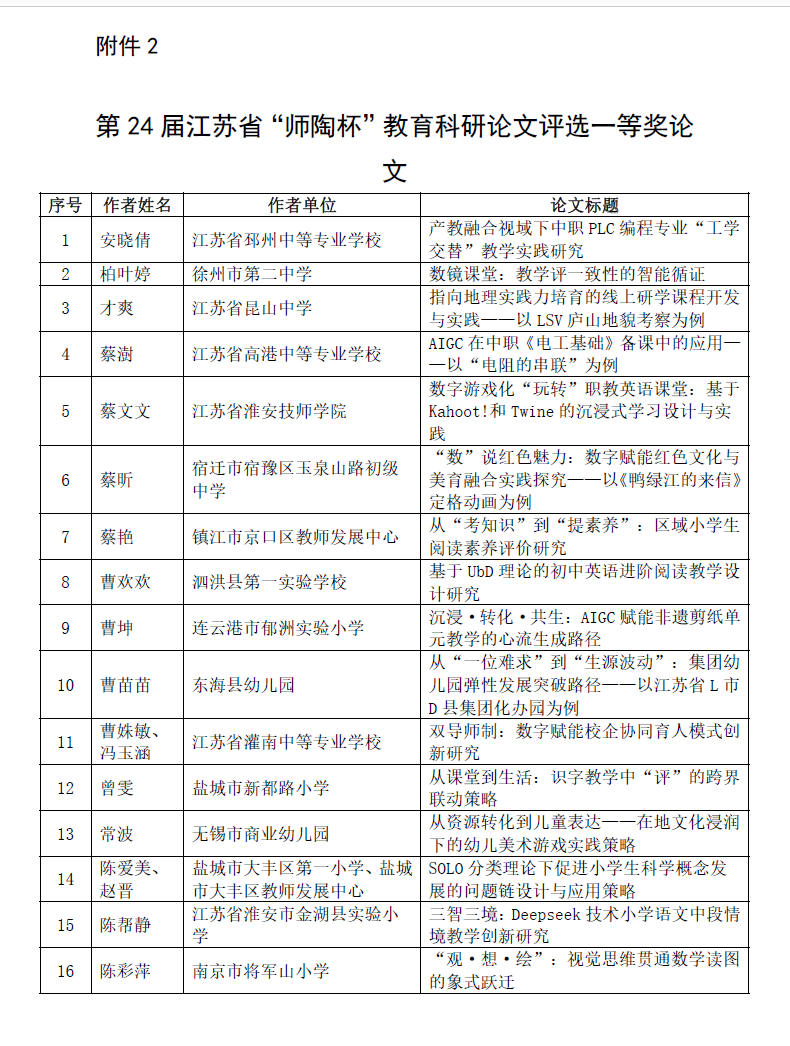 季春花老师论文在第24届江苏省“师陶杯”教育科研论文评选中获一等奖