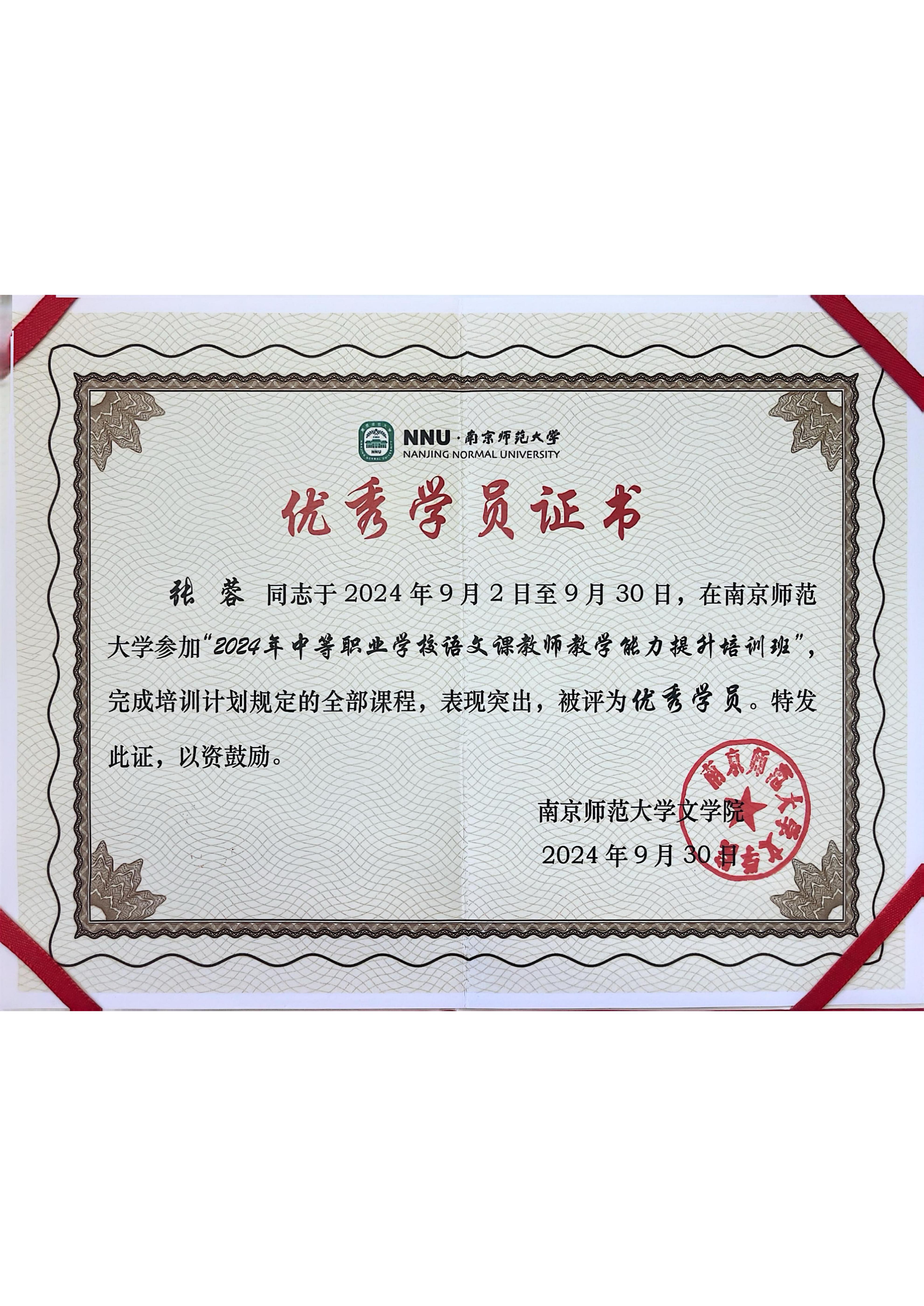 季春花名师工作室成员张蓉老师在2024年国家级培训中获评“优秀学员” 2025-09-29