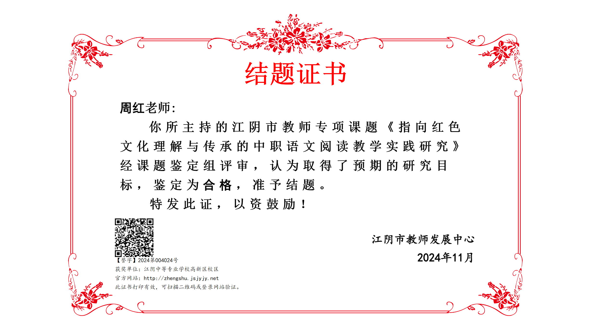 季春花名师工作室成员周红老师江阴市教师专项课题结题证书