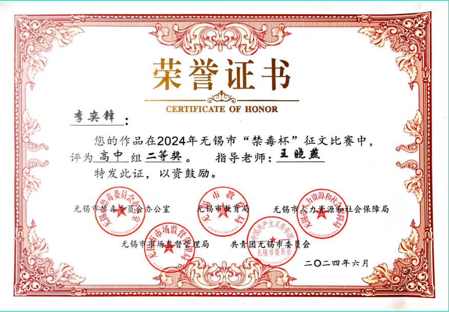 季春花名师工作室成员王晓燕老师指导学生在2024年无锡市“禁毒杯”征文比赛中获二等奖